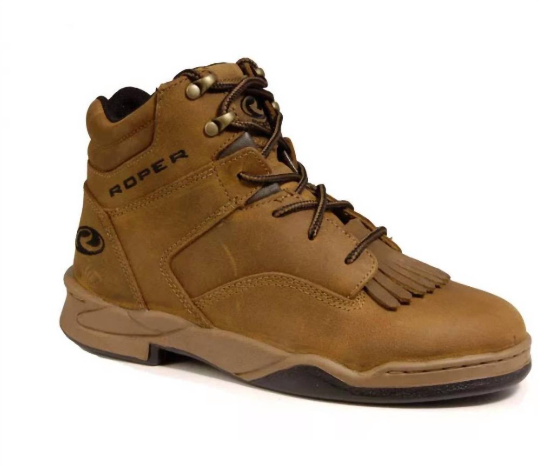 Step into style and support with the Men's Horseshoes With Kiltie Riding Shoe by ROPER, a perfect blend of form and function for the Western enthusiast. Featuring a leather upper with a steel shank and round toe for stability, this boot showcases a non-marking rubber outsole and a sturdy 9/16" riding heel. With an oiled leather composition and a 3/4 ankle height, the shoe ensures a comfortable fit thanks to its removable comfort footbed and Nylex lining. Ideal for adult men, it's a timeless addition to your riding gear in a classic brown hue.