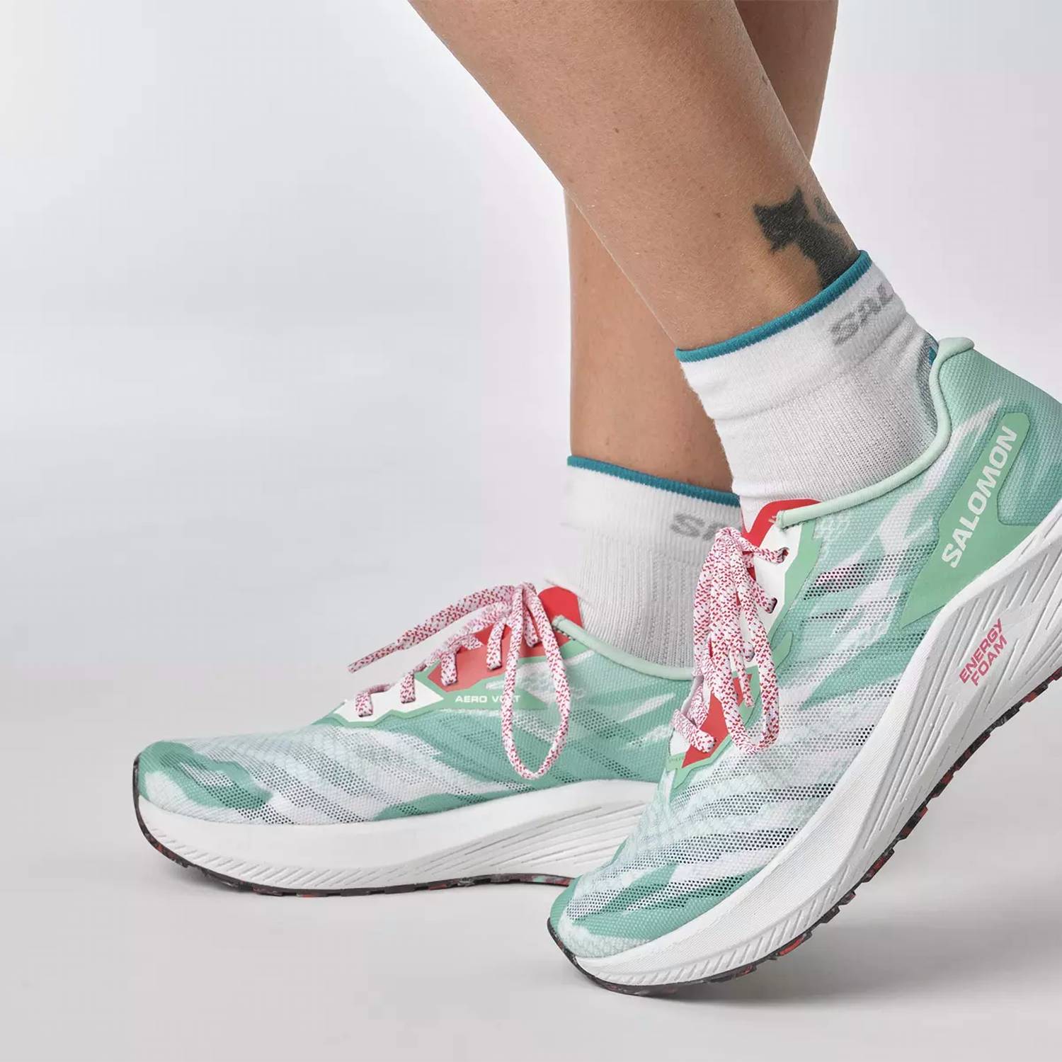 When fashion meets function. Experience the ultimate in lightweight comfort with the SALOMON Women's Aero Volt Running Shoe, engineered for every run. This shoe features a textile lining and inlay sole, complemented by a textile and synthetic upper for breathable support. Designed with an 8mm drop and weighing only 186g, it offers moderate cushioning ideal for 2-3 runs per week. The regular lace closure and rubber outsole ensure secure footing and durability. Available in Yucca/White/Poppy Red, it's perfect for summer athleisure and travel adventures.