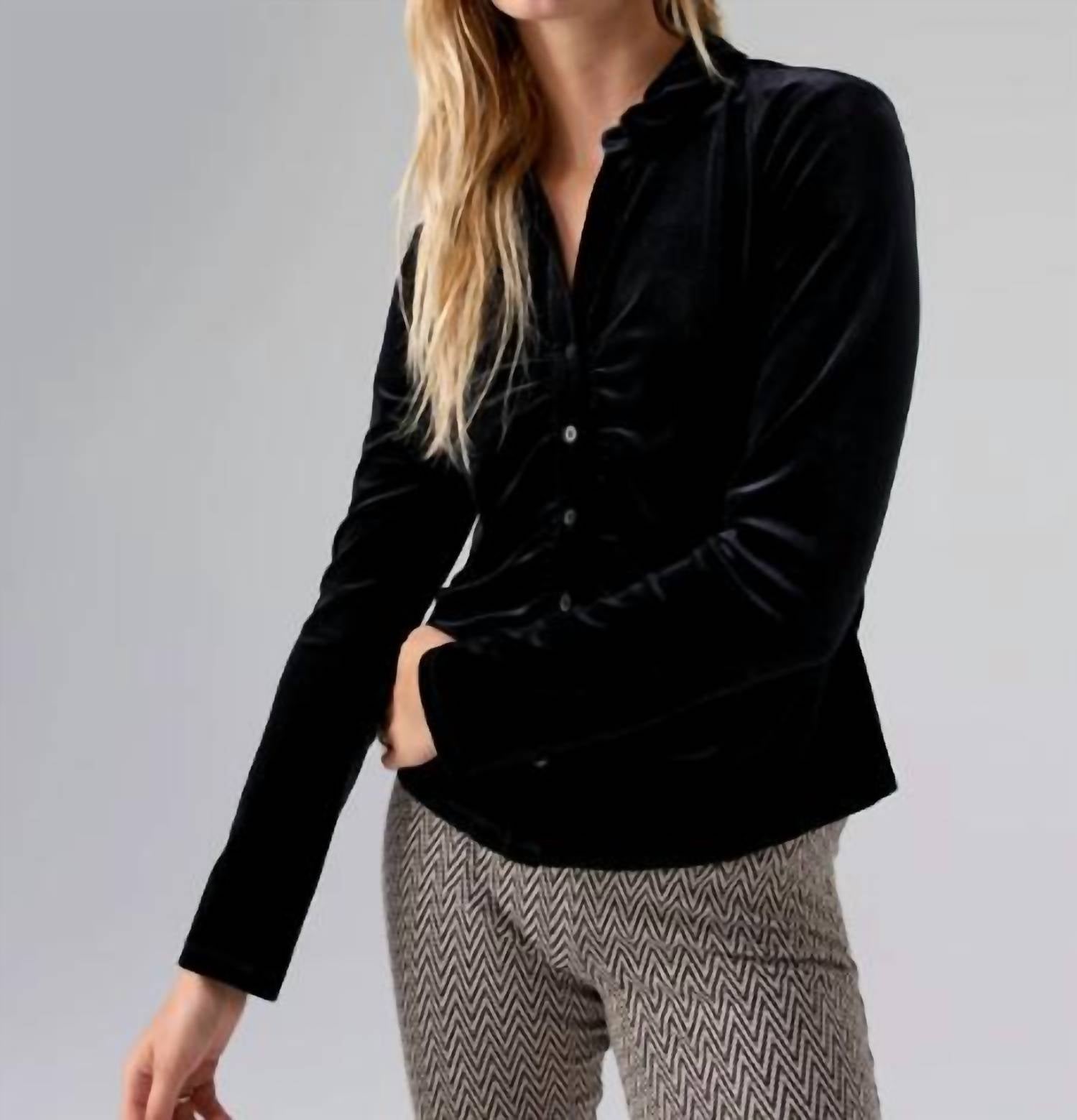 Pair this with your favorite jeans and slides for your next girls night out.This festive, black velvet blouse offers a flattering silhouette with a fitted shape and ruched, button front. Style with printed trousers for an office look, or pair it with your favorite denim and a bold lip for a night out. Black, velvet. Button, ruched front. Fitted silhouette. The material is 94% Polyester 6% Spandex. The blouse is very fitted, we recommend sizing up. The model is 5'9" and is wearing a size small; 5'10 and is wearing a 1X. Care instructions: Machine wash cold, Line dry