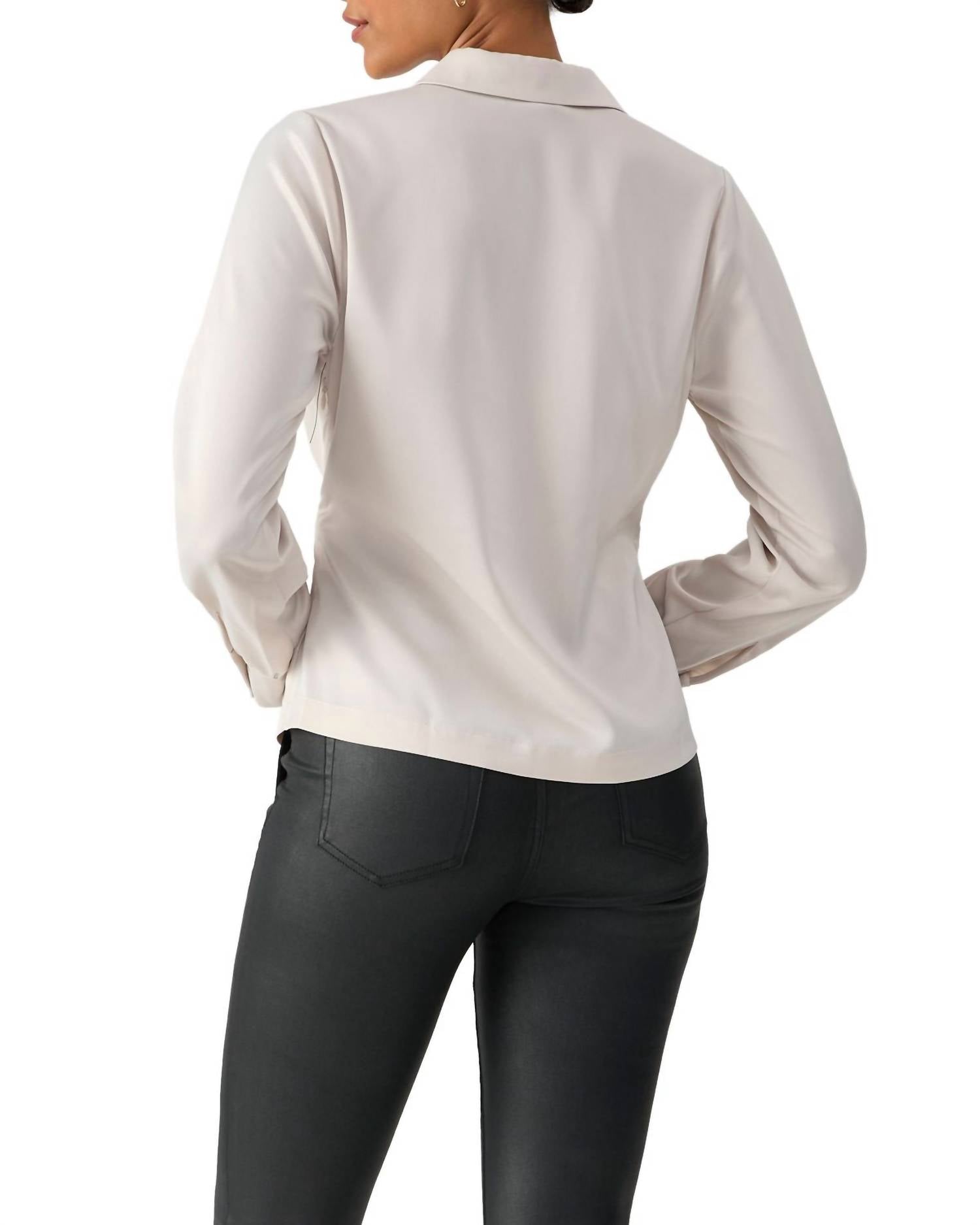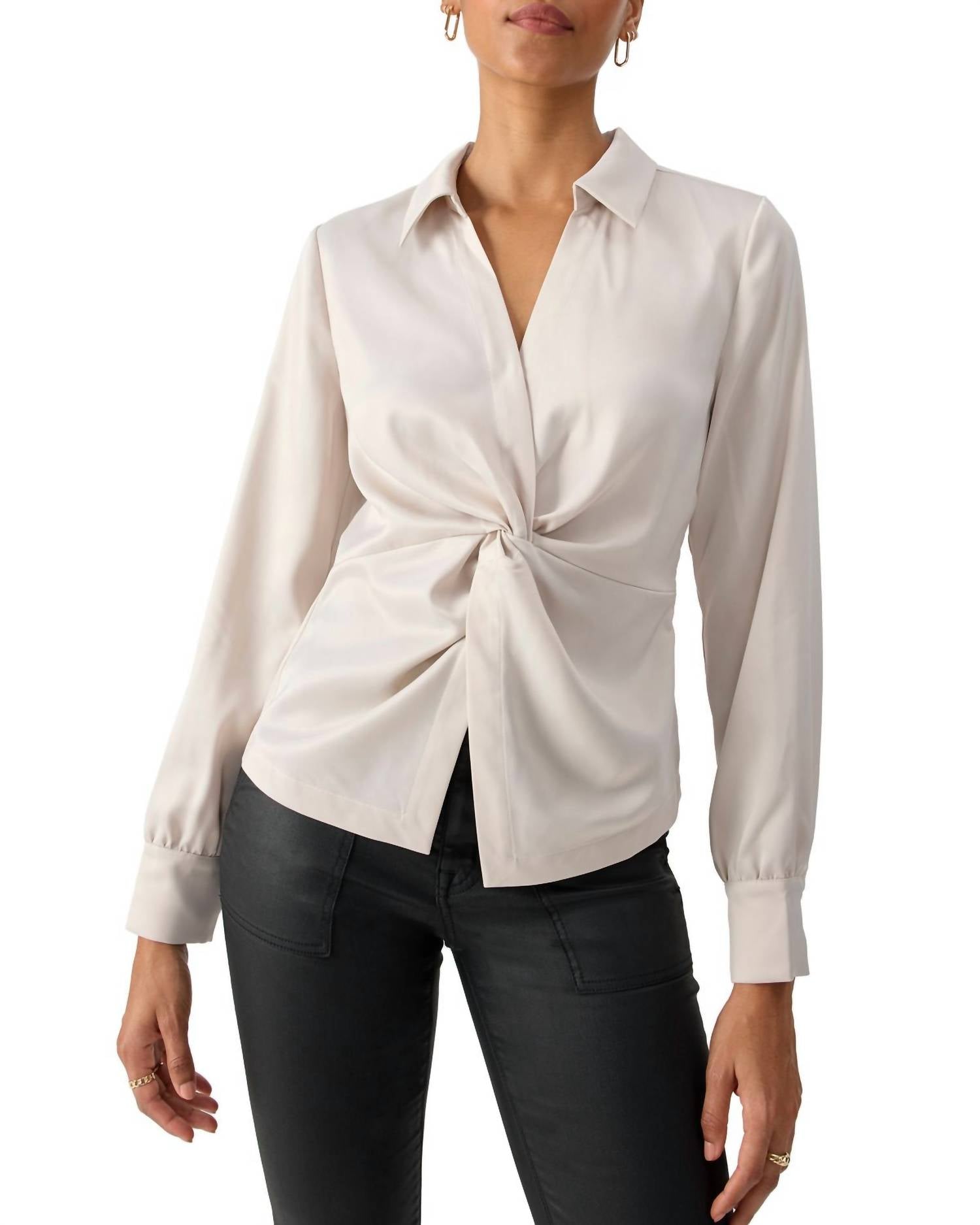 A versatile blouse that works from desk to dinner!Show off the twist-front detail with a tapered trouser and flats for a look that'll get you through any interview with style. Off white, satin blouse. Twist front detail. Relaxed fit. The material is 97% Polyester 3% Spandex. The blouse runs true to size. The model is 5'9" and is wearing a size small. Care instructions: Machine wash cold, Lay flat to dry