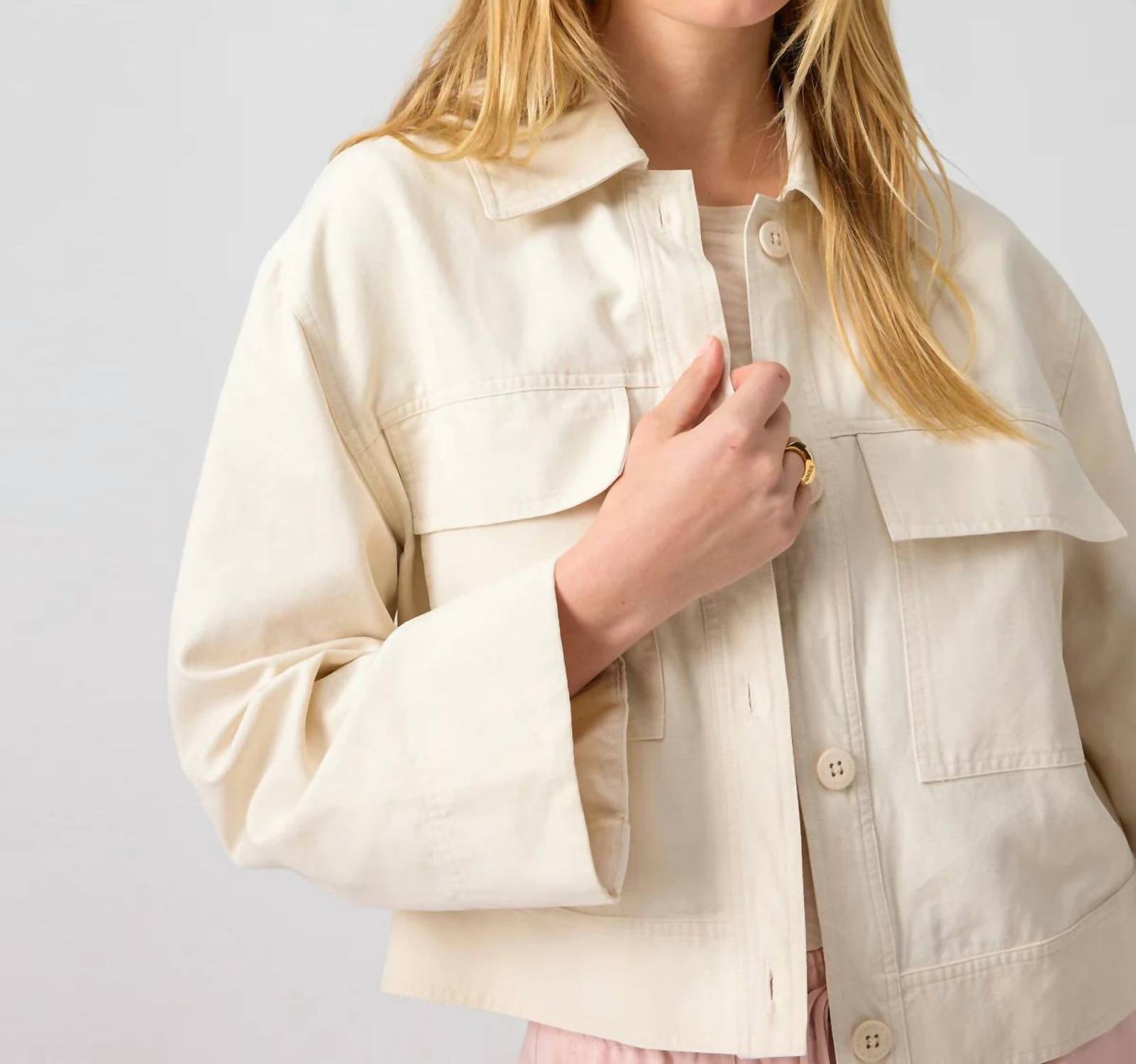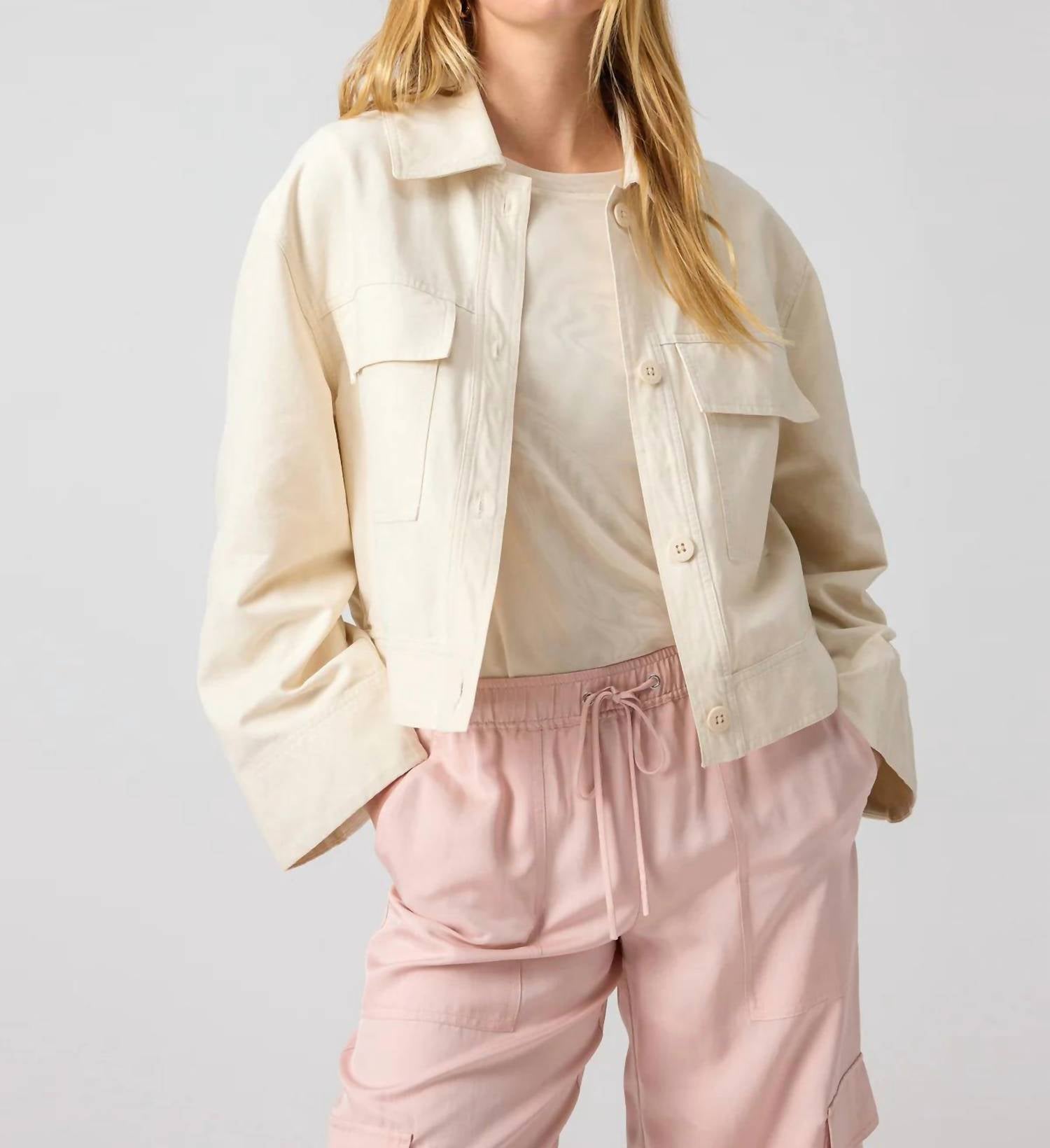 A jacket so versatile you can literally wear it with anything.This lightweight jacket boasts a boxy fit and front pocket detail. Light to medium weight jacket. Woven canvas. Two front pockets. Elastic back waistband. Button front. 53% Cotton, 47% Lyocell. The fit is relaxed.