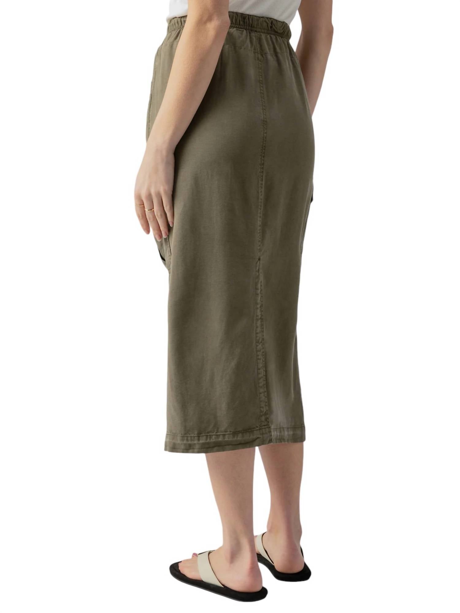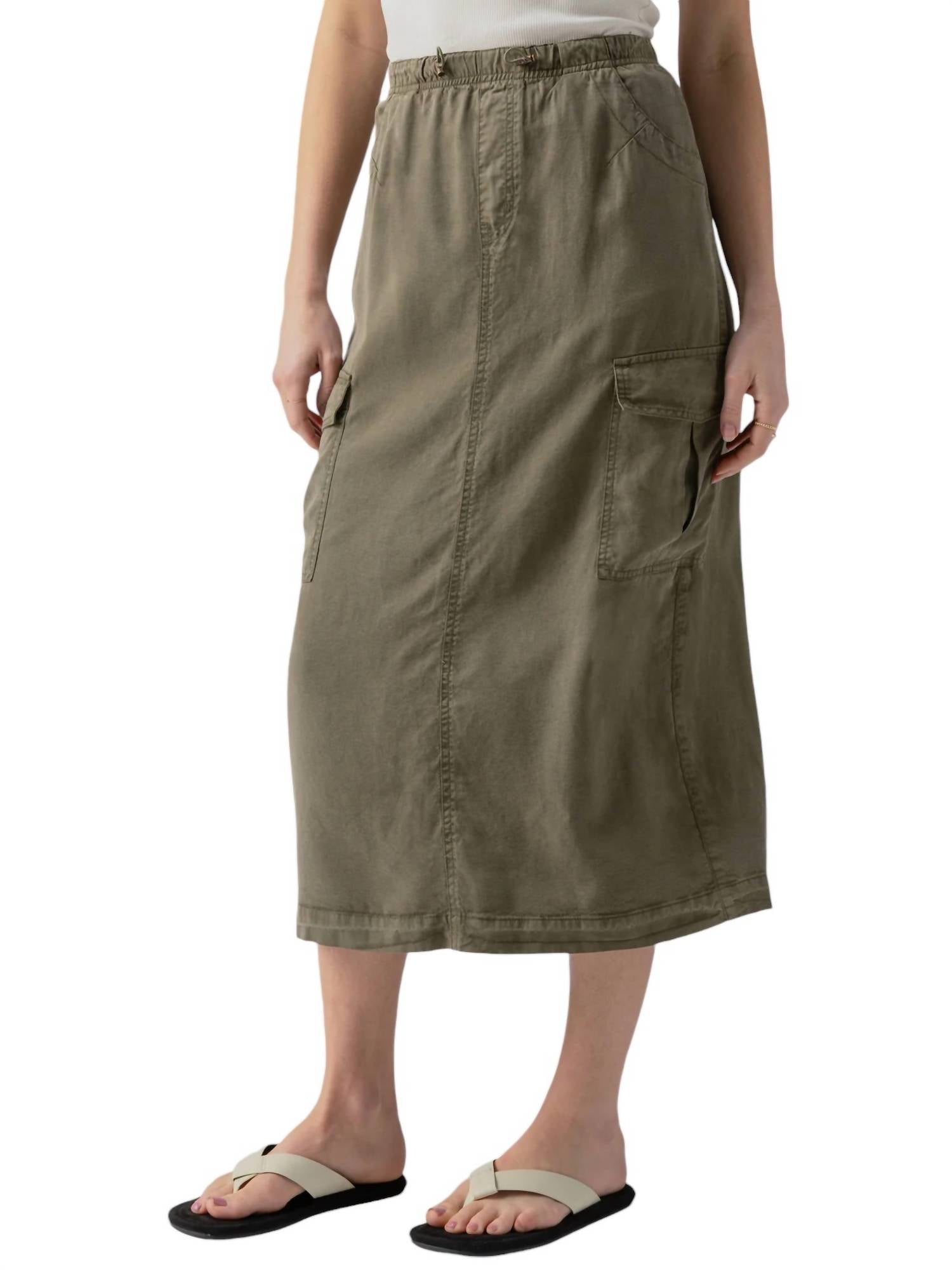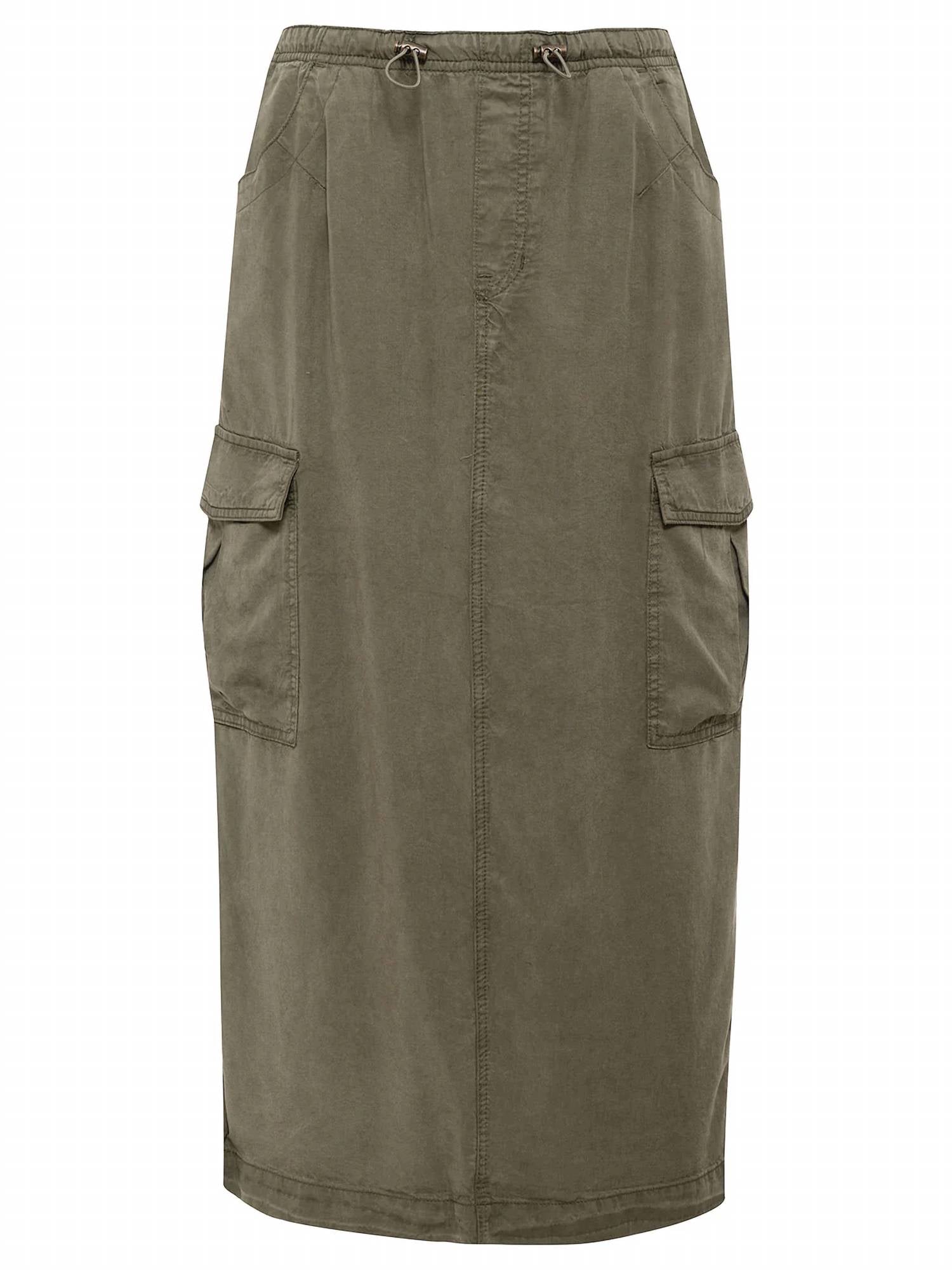 Tuck your favorite tee into this midi length skirt for an effortlessly cool look.This cargo skirt features an elastic toggle waistband for a comfortable and adjustable fit. Designed with two front side cargo pockets, it offers practicality along with a relaxed silhouette. Crafted from 100% lyocell, this skirt is made from fluid Tencel, ensuring a soft and breathable feel. The model is 5'8" and is wearing a size 27. The skirt measures approximately 34 inches in length.