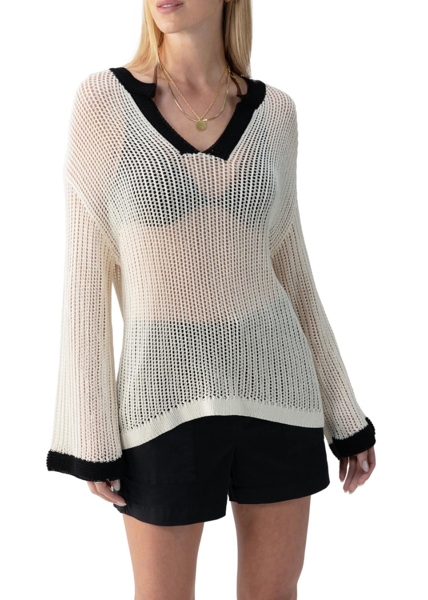 You're going to want to pack this for your next vacation!This lightweight crochet knit sweater features a contrasting band at the V neckline and cuffs. It has a relaxed fit with ribbed cuffs and hem. The sweater is 24 inches long (size Small) and is made from 88% viscose and 12% nylon. It is hand washable and imported.