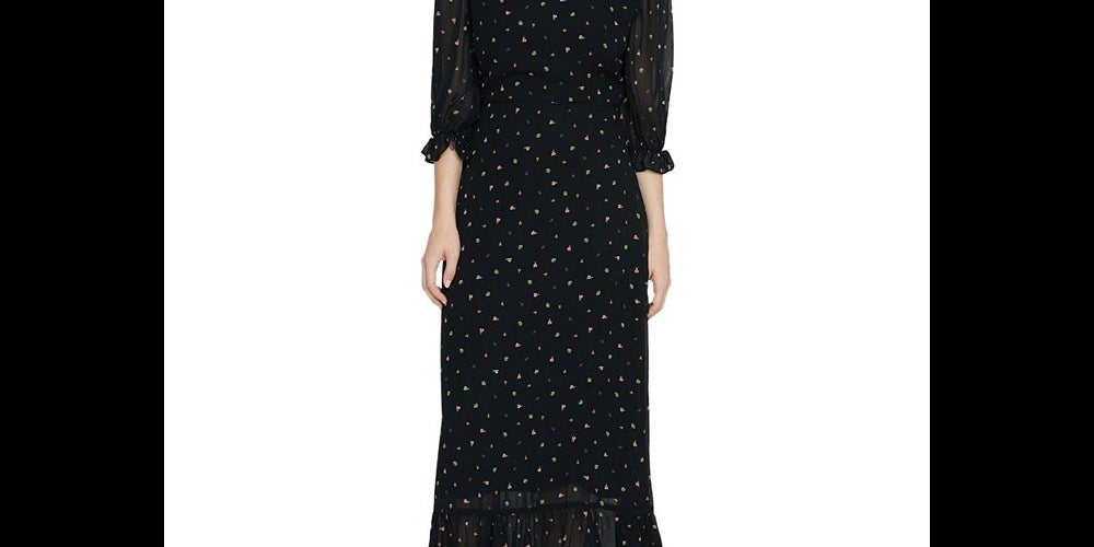 Jump in on the midi trend with this oh-so-modest dress from Sanctuary. | Approx. 51-1/2 long from center back neck to hem| Crewneck; A-line silhouette| Back button closure with keyhole opening| 3/4-sleeves; ruffled cuffs| Allover print; ruffled hem| Rayon