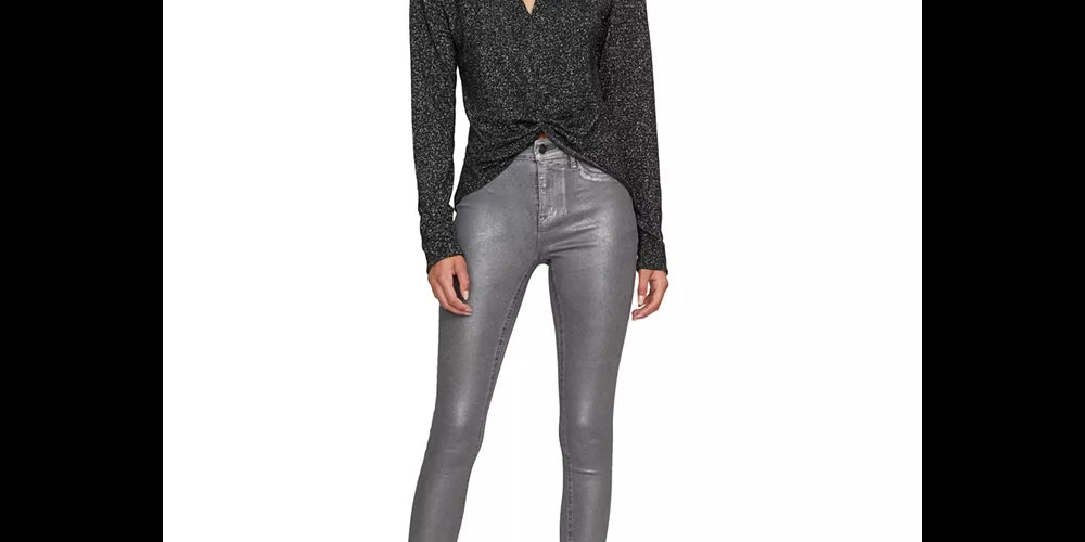 Approx. 24" long at back|Plunging V-neck|Draped front with knot detail at center front hem|Rayon/polyester/nylon/metallic|Machine washable|Imported
