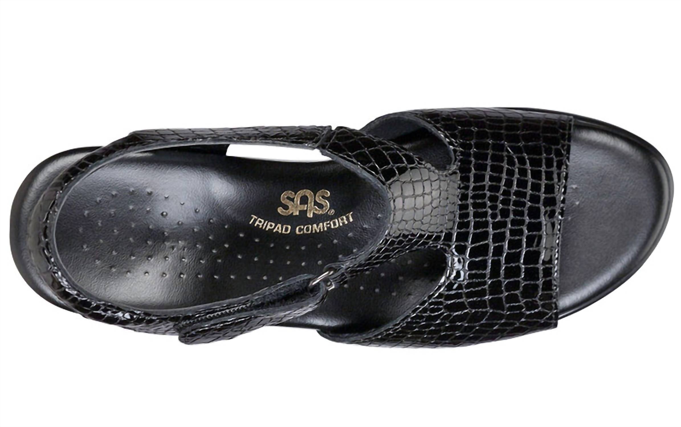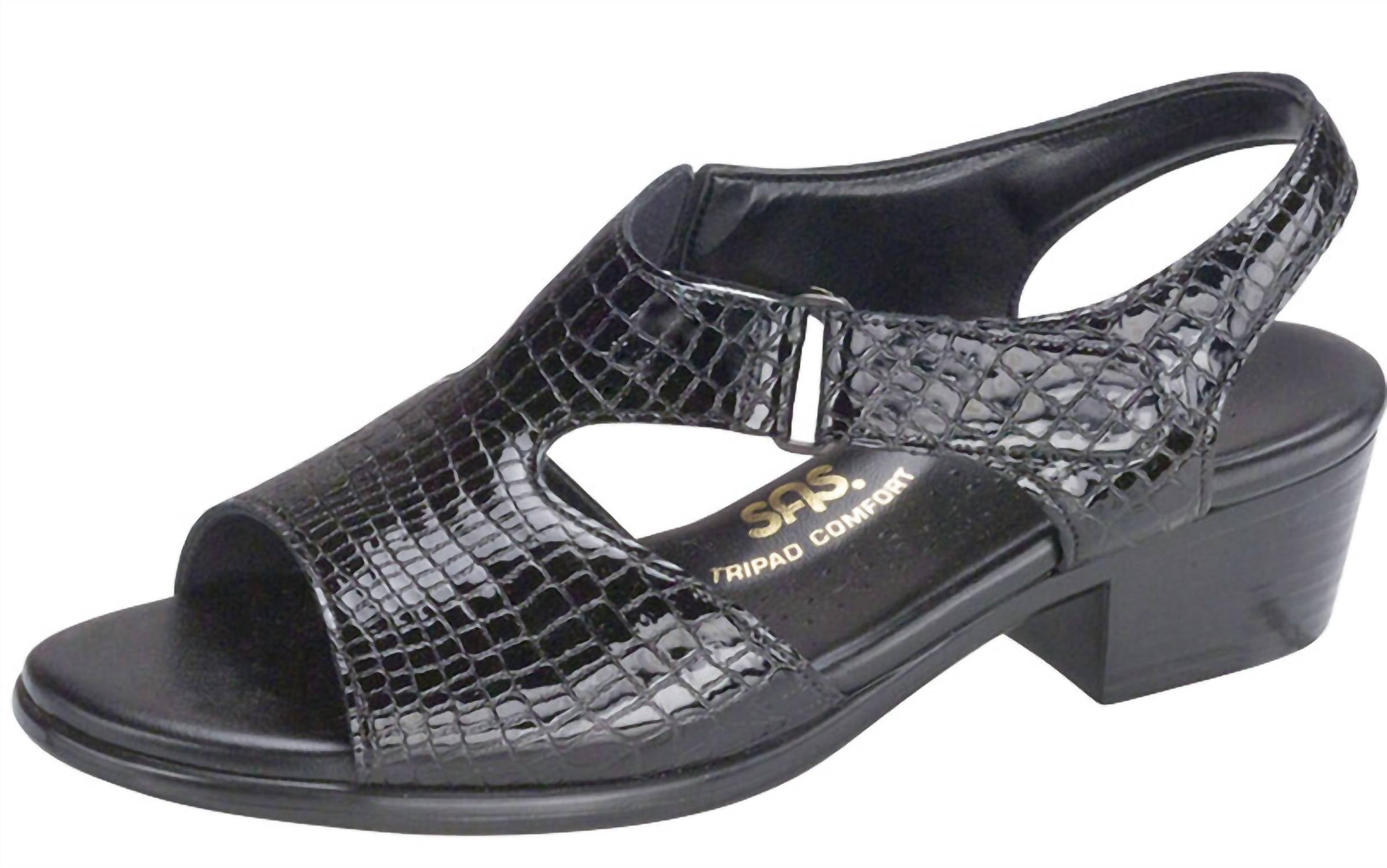 Classicly cute and all-day-wearable. We love this sandal. Step into comfort with the SAS Women's Suntimer Heeled Sandal in Black Croc, crafted with a premium leather upper for a soft feel against the foot. Featuring a 1.625" block heel, these sandals incorporate the SAS EZ Strap™ system for a snug, adjustable fit and extra toe room for all-day comfort. The contoured footbed offers full-length shock absorption, ensuring your foot rests naturally into the sandal. Ideal for a medium-width fit, this sandal seamlessly blends style with the renowned SAS tripad comfort technology.