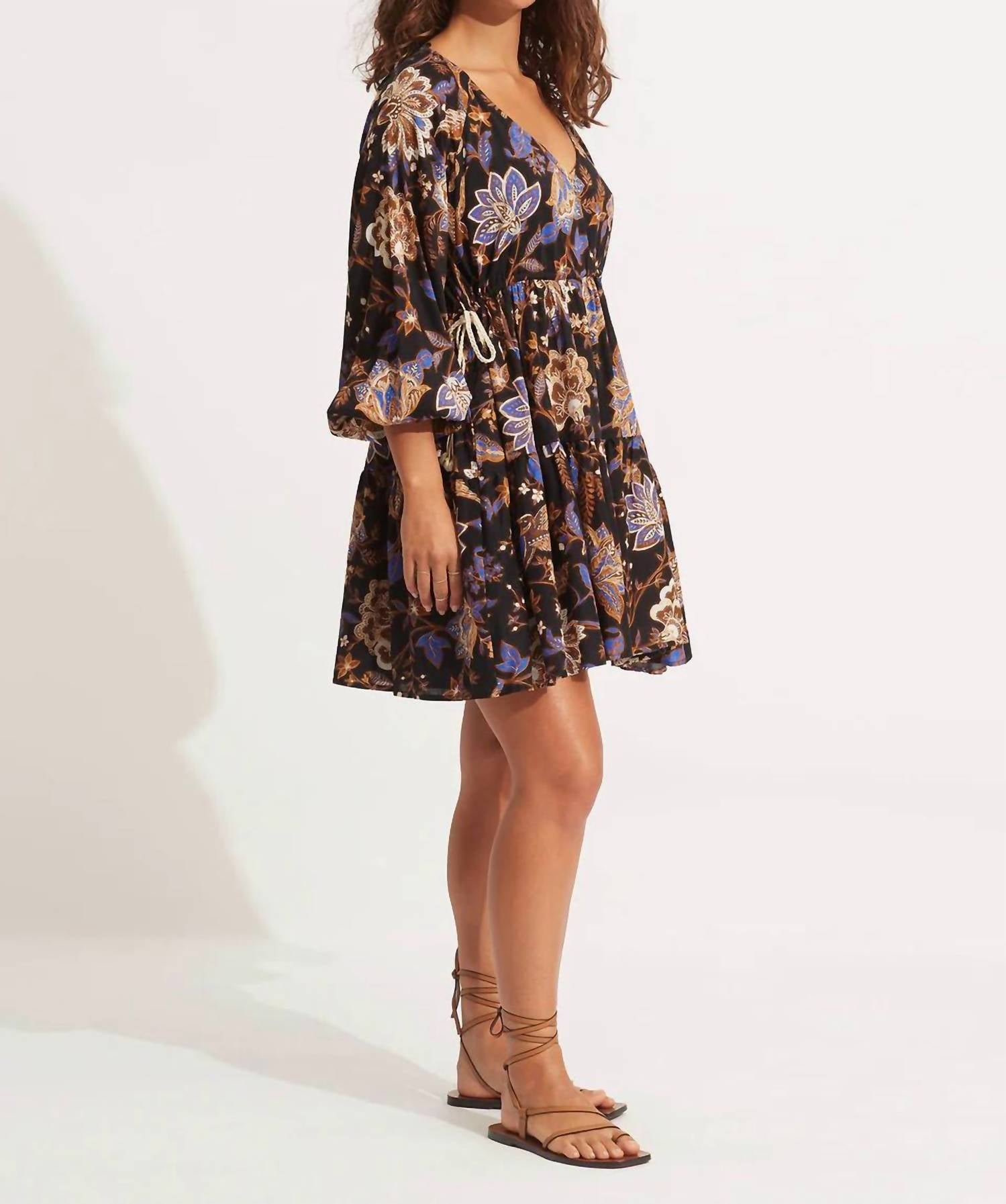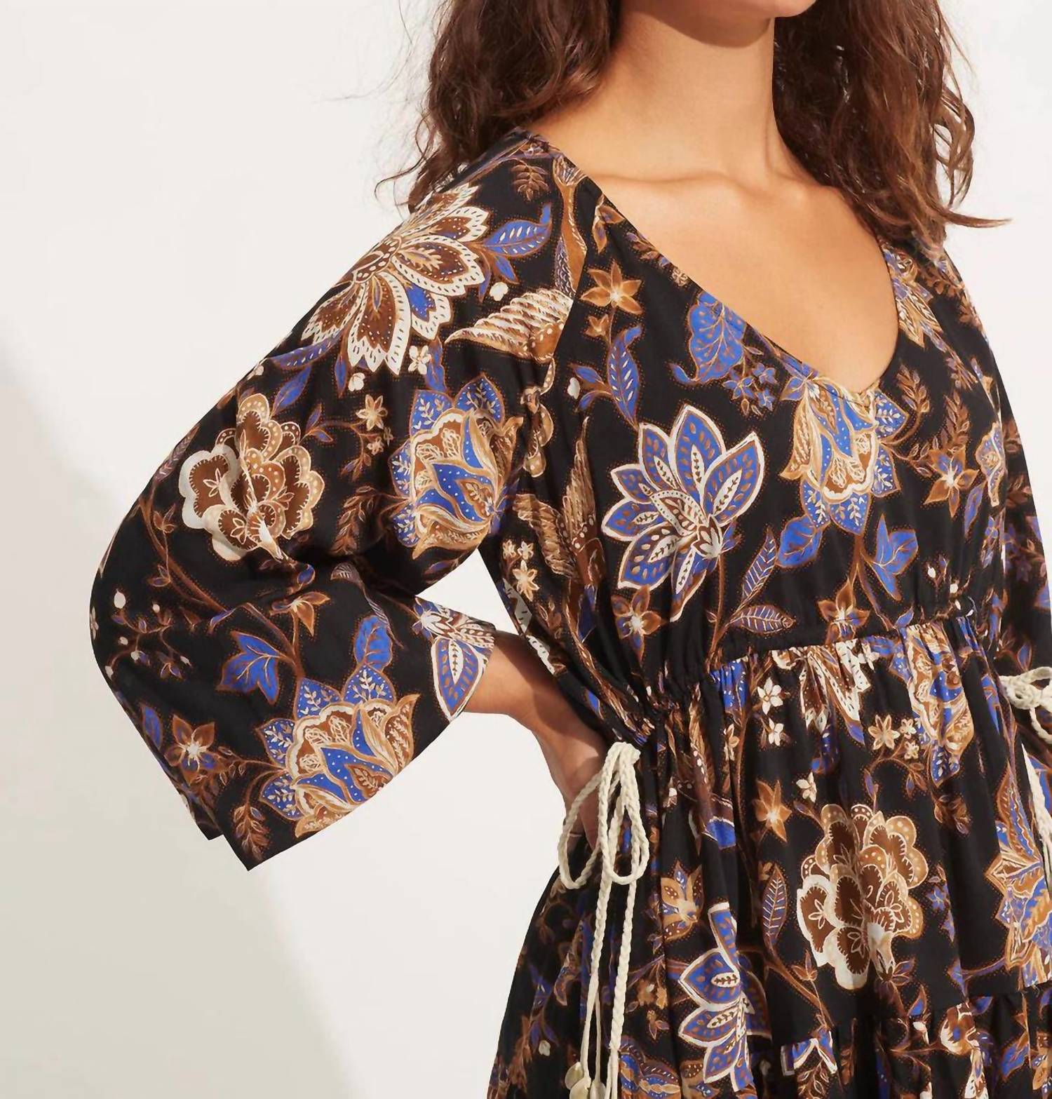 The kind of easy and flattering dress you'll be reaching for all season long. Elevate your vacation wardrobe with the Seafolly Silk Road Tier Mini Dress in timeless black. This A-line dress features three-quarter sleeves with soft elasticated hems and a flattering V-neckline. Crafted from a cotton blend of 50% cotton and 50% viscose, it boasts a tie closure and tiered detailing for a boho chic look. Measuring 88 cm in length for a size S/10, this above knee-length dress requires hand washing and hang drying to maintain its allure.