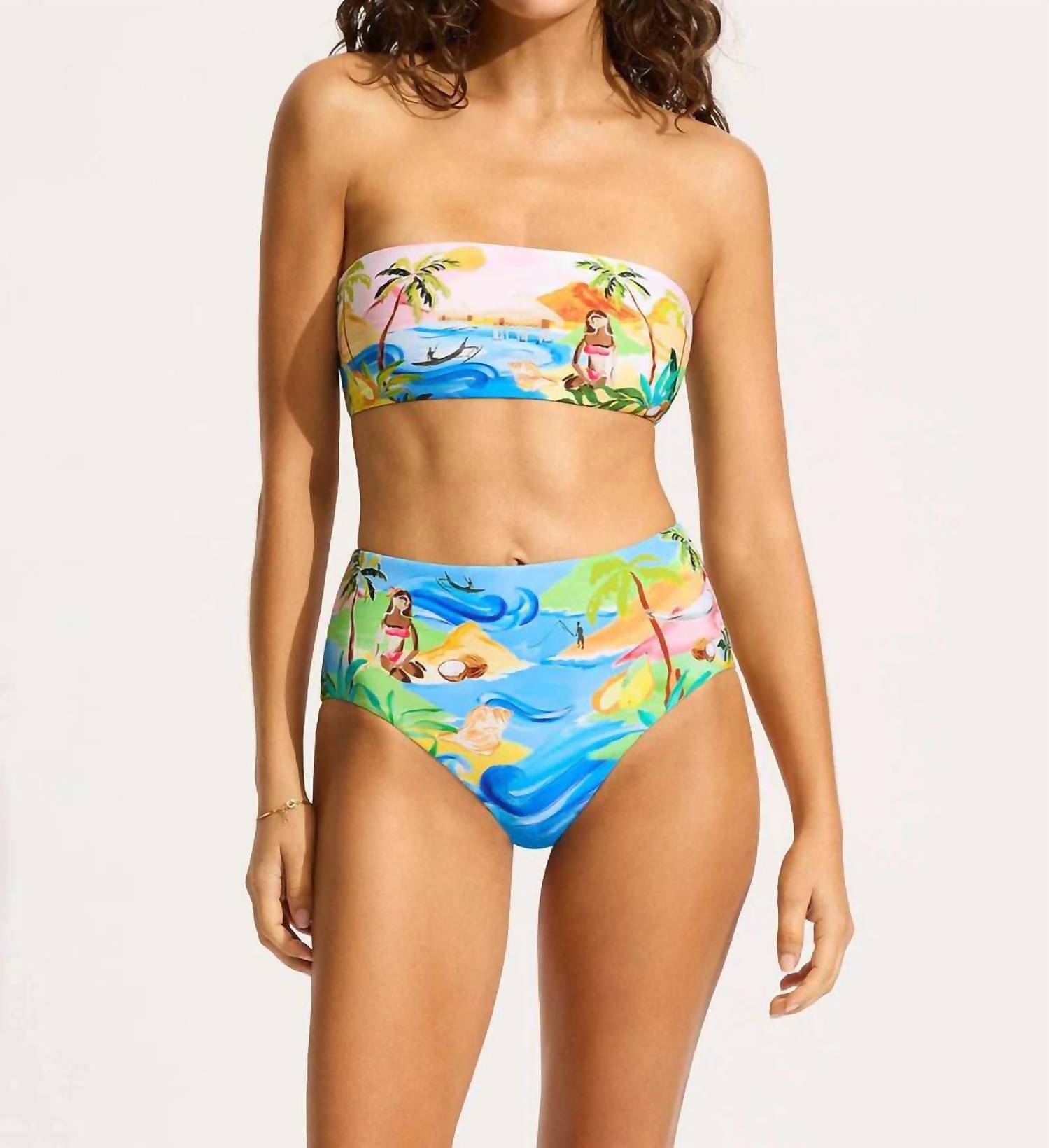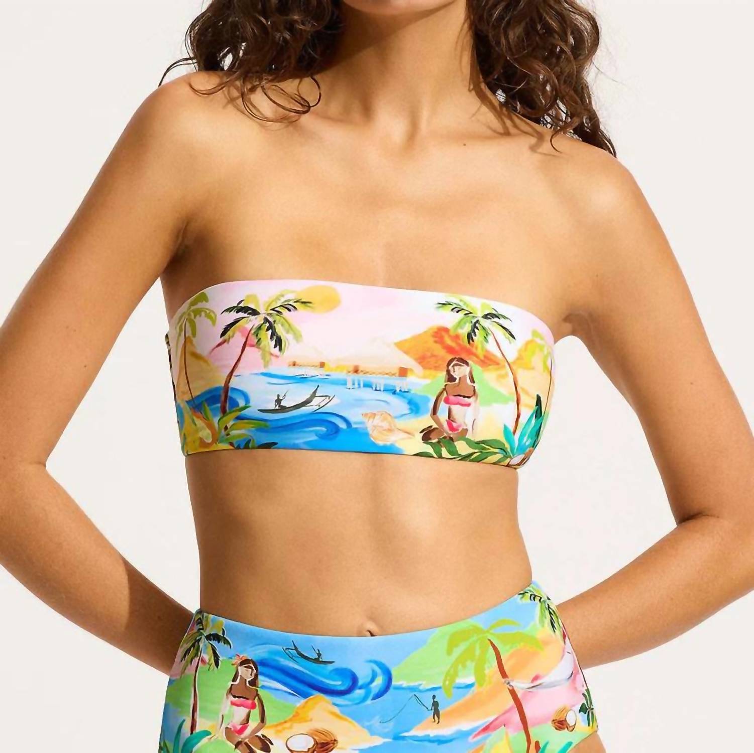 Dream of your next beach getaway in this cute little number. Pair with strappy sandals, a floppy hat, and an oversized tote to complete the perfect vacation look. Embrace the beach in style, boho chic piece perfect for a sunny day at the shore. Turquoise hue and graphic placement print bring vibrancy, while the bandeau style offers classic coverage. Features removable cups and side boning for shape support, along with a back clip closure and a removable strap for a customizable fit. Crafted from 78% recycled nylon and 22% elastane. Adheres to sustainable fashion. Designed for hand wash care to ensure longevity.