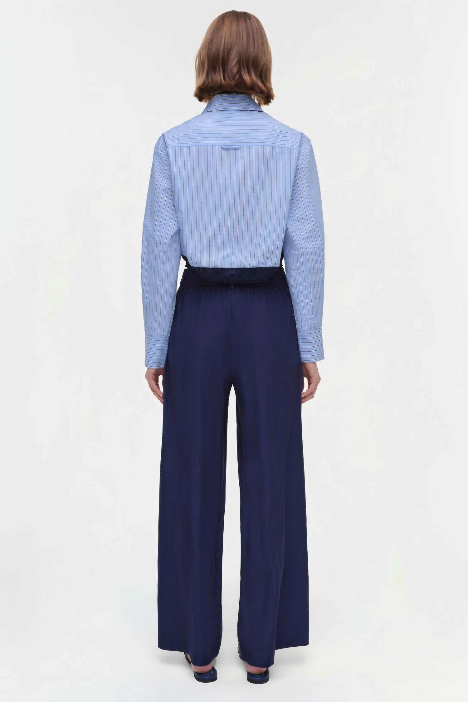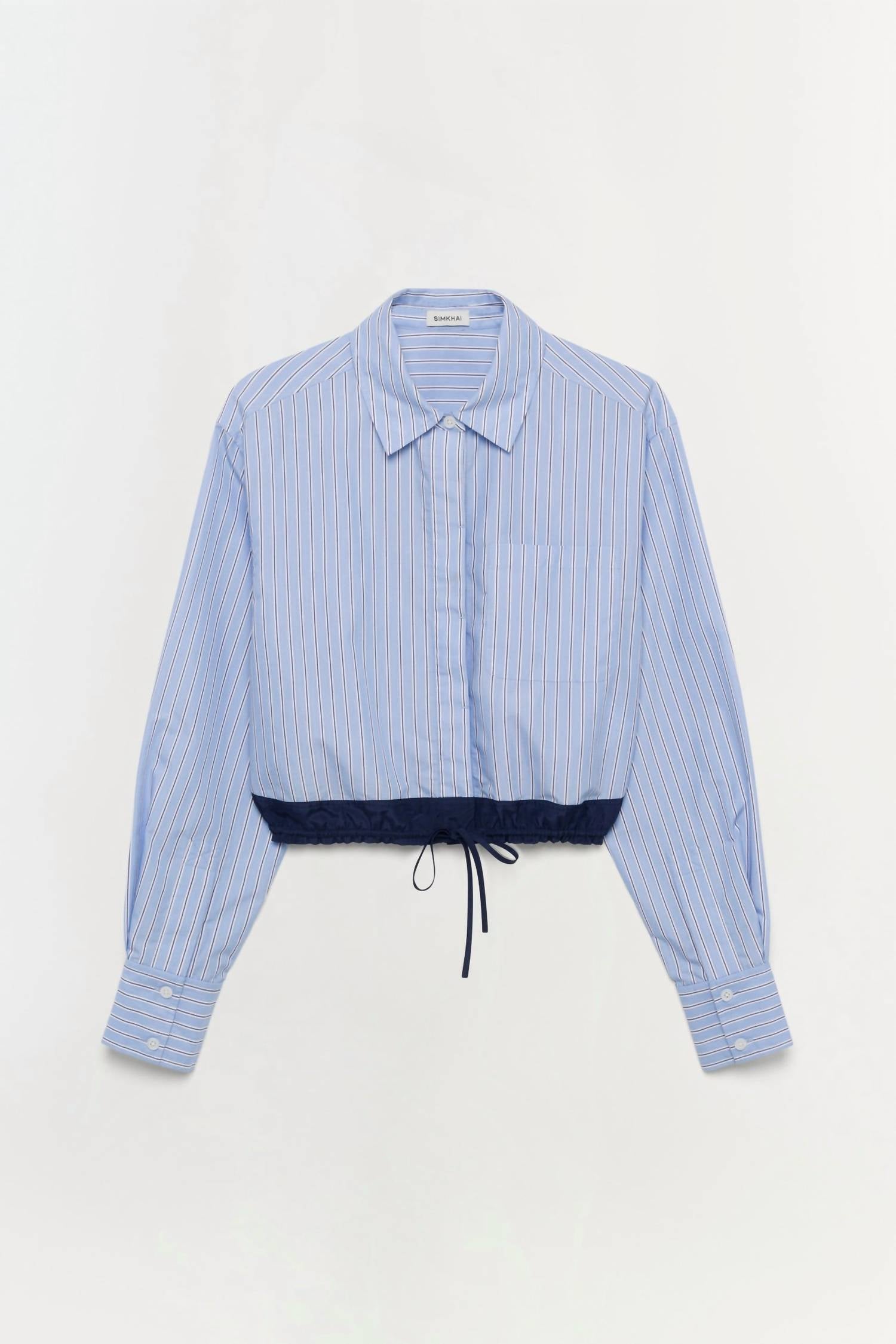 A classic button down shirt that will never go out of style. Elevate your wardrobe with the Adryck Long Sleeve Shirt by Simkhai, featuring a refined Harbor Blue Stripe design. This women's shirt boasts long sleeves with button cuffs and a concealed button-front closure, providing a tailored appearance. Made from a cotton blend of 65% Polyester and 35% Cotton, with trim in 100% Acetate, it offers a sophisticated spread collar and a practical chest patch pocket. The cropped length and unique drawstring waistband complement its classic stripe pattern, ensuring a perfect blend of timeless charm and contemporary style. Care instructions: Machine wash.
