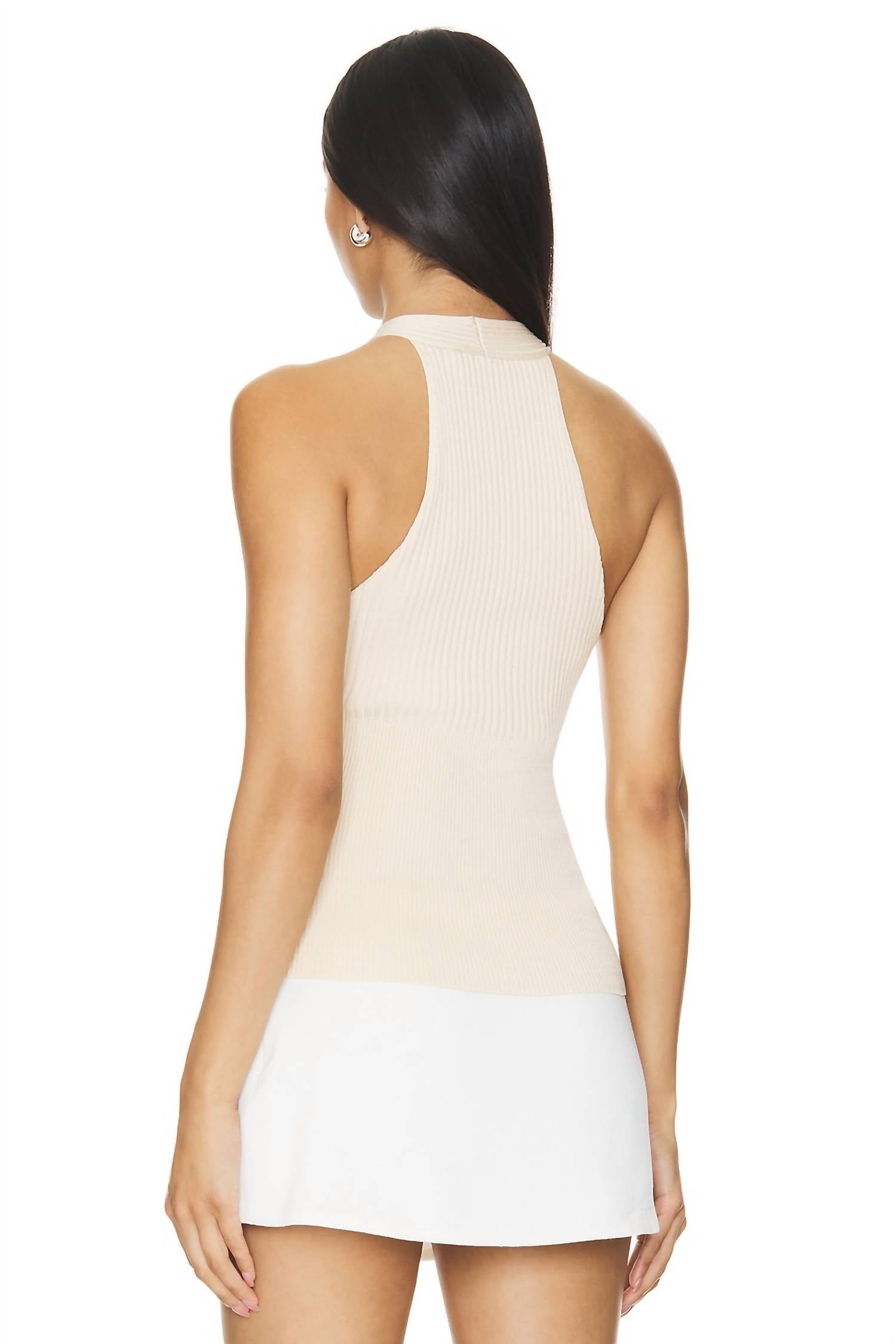 Fit, fabric and functionality. This tank top checks all the boxes. Elevate your summer wardrobe with the Andrea Halter Tank Top by SIMKHAI, a chic choice for evening events. This sleeveless top, available in a solid ivory hue, features a flattering halter neckline. Crafted from luxurious rayon, it offers a stylish and comfortable wear with a pull-on closure for easy dressing. For best results, dry clean only.