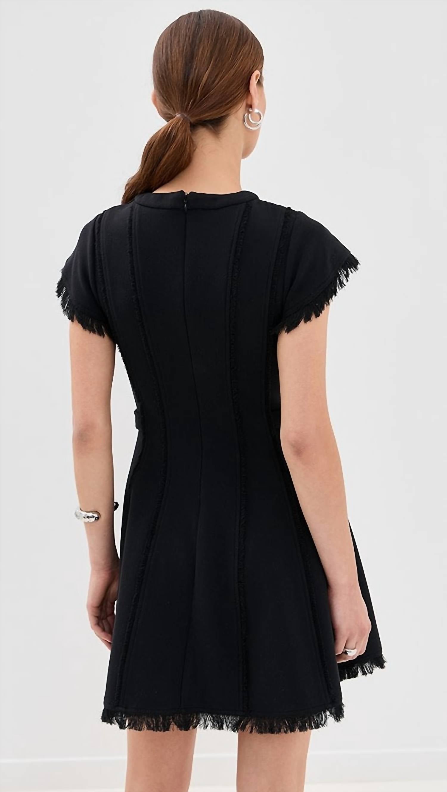The perfect mini dress for those warmer months. Introducing the Anielle Short Sleeve Mini Dress by SIMKHAI, a chic addition to your vacation wardrobe in classic black. This textured dress features a mini-length A-line silhouette and a soft, stretch rayon-blend fabric. Closure is a convenient zip closure, complemented by a crewneck design. The dress runs large, so please consider sizing down for the perfect fit. Length from shoulder: 33 inches (84.0 cm). Model Mia, 5'9", is wearing a size 0.