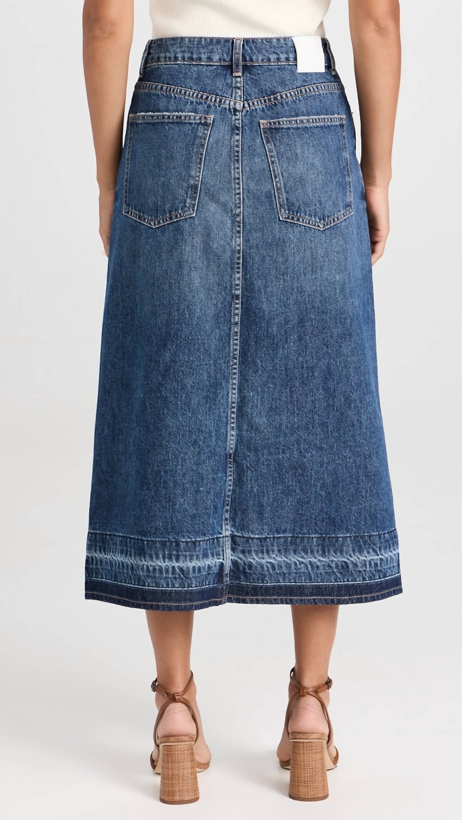 Tuck your favorite tee into this midi length skirt for an effortlessly cool look. Elevate your wardrobe with the Della Release Hem Midi Skirt by SIMKHAI, crafted in a Coronado-hued, heavyweight, non-stretch denim for a truly flattering fit. This midi skirt is made in the USA, featuring a front slit and classic five-pocket styling. Composition: 100% Cotton. Closure: Button closure with a zip fly. Care instructions: Machine wash cold.