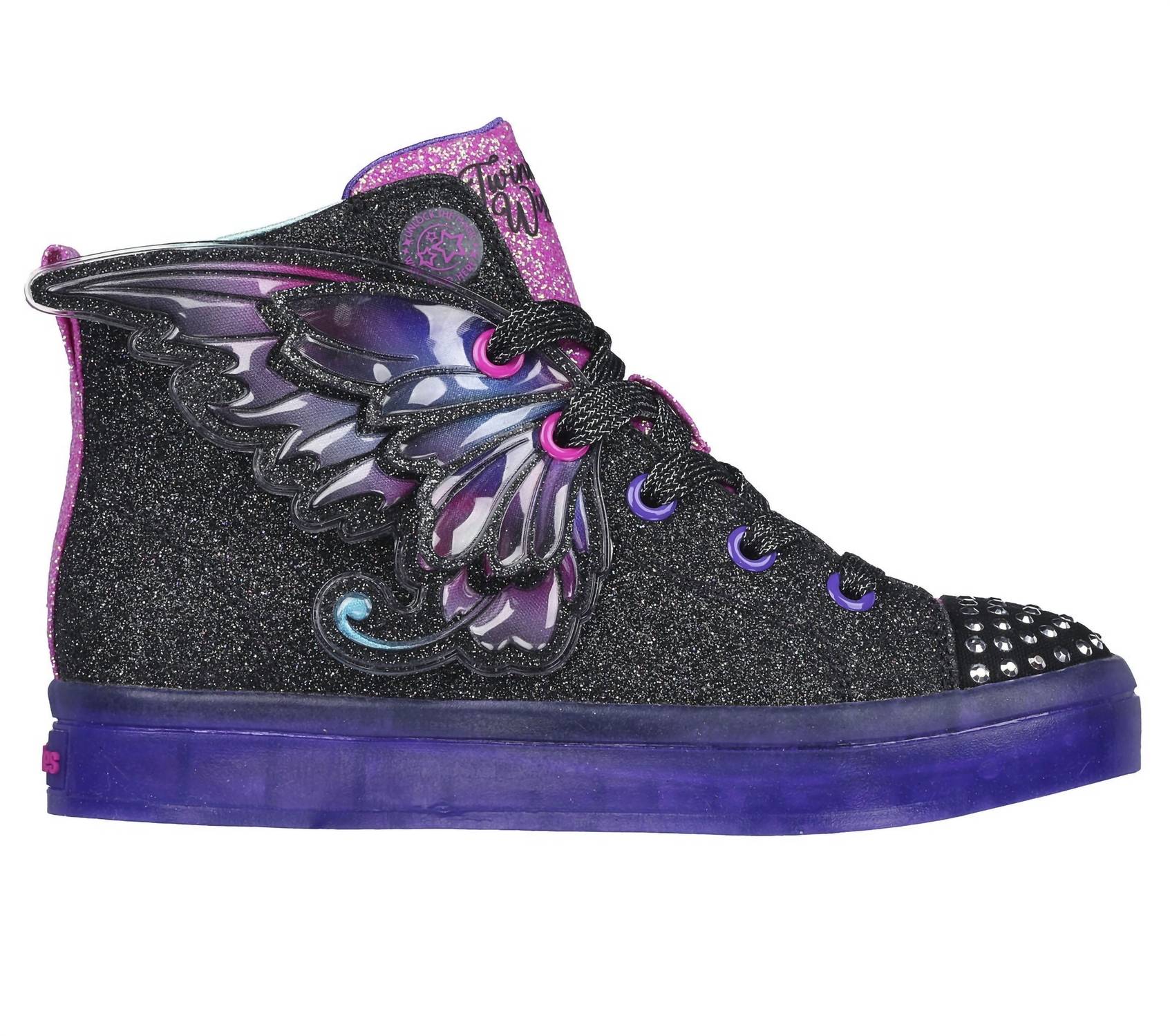 Introduce her to the magical world with the Skechers Twinkle Toes®: Twi-Lites 2.0 - Twinkle Wishes sneakers. These high-top, lace-up sneakers for little girls boast a synthetic glitter finish in black that will dazzle her day. The light-up fairy wing tech piece and rhinestud embellished toe cap add interactive fun with every step. Perfect for young fashionistas who love a touch of sparkle in every step.