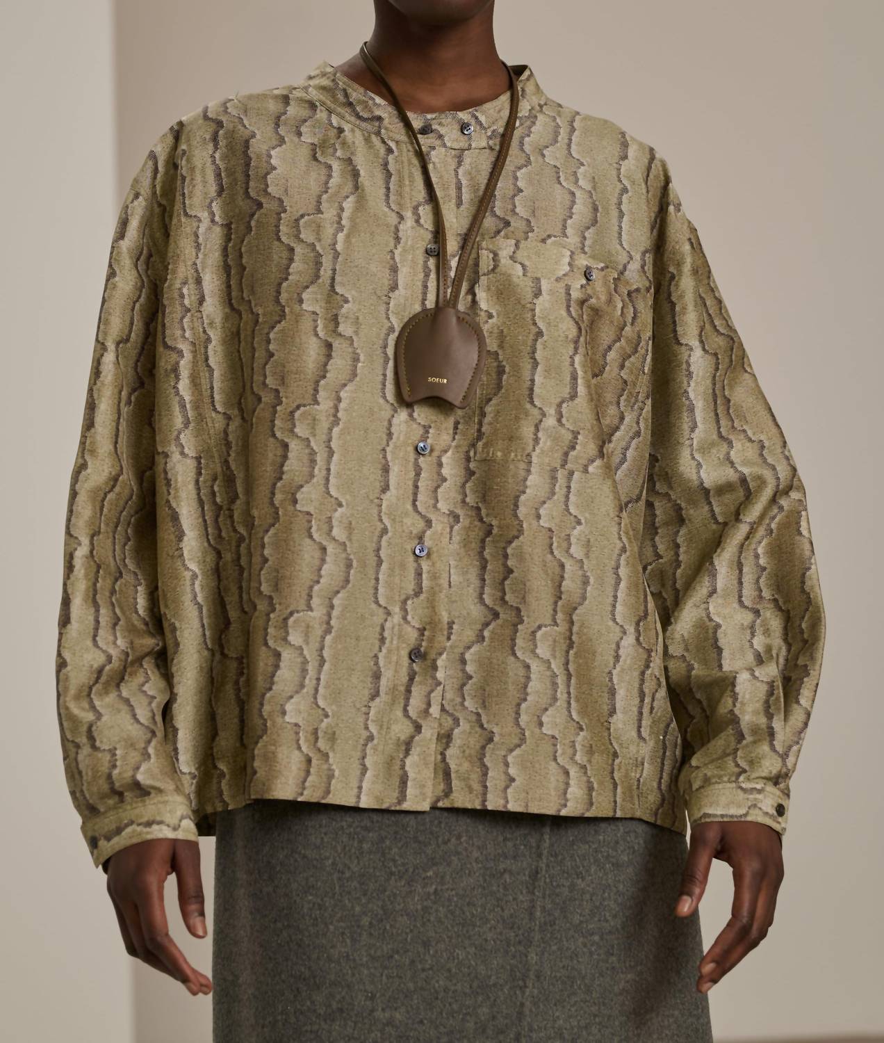 Pair this with your favorite jeans and slides for your next girls night out. Introducing the Soeur Chypre Shirt, an elegant patterned blouse in a sophisticated moiré print, perfect for your evening events. Crafted from 13 mm 100% silk dupion, this piece features long and wide sleeves, a mandarin collar, and a button closure. Made in China, this blouse is as practical as it is stylish, complete with a functional patch pocket on the front. Care for this luxurious top by hand washing it in cold water.