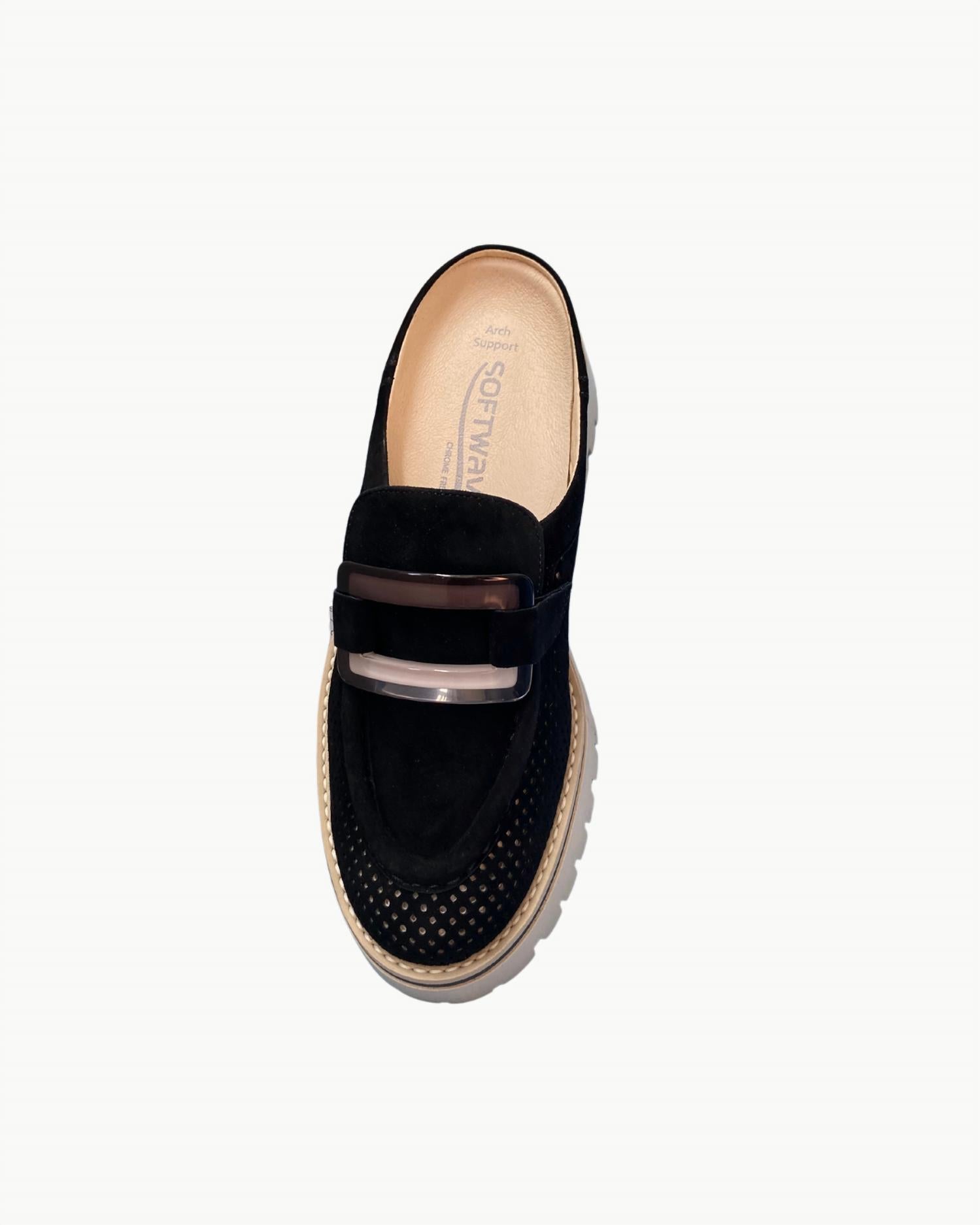 A trend that everyone is loving and this style might just be our favorite. Step into sophistication with Softwaves' loafer sandals. These elegant black and cream slip-ons combine the ease of a loafer with the airy comfort of a sandal. Featuring a stylish platform sole, they are perfect for adding a touch of class to any outfit.Arch supportApproximately 1.5" heel