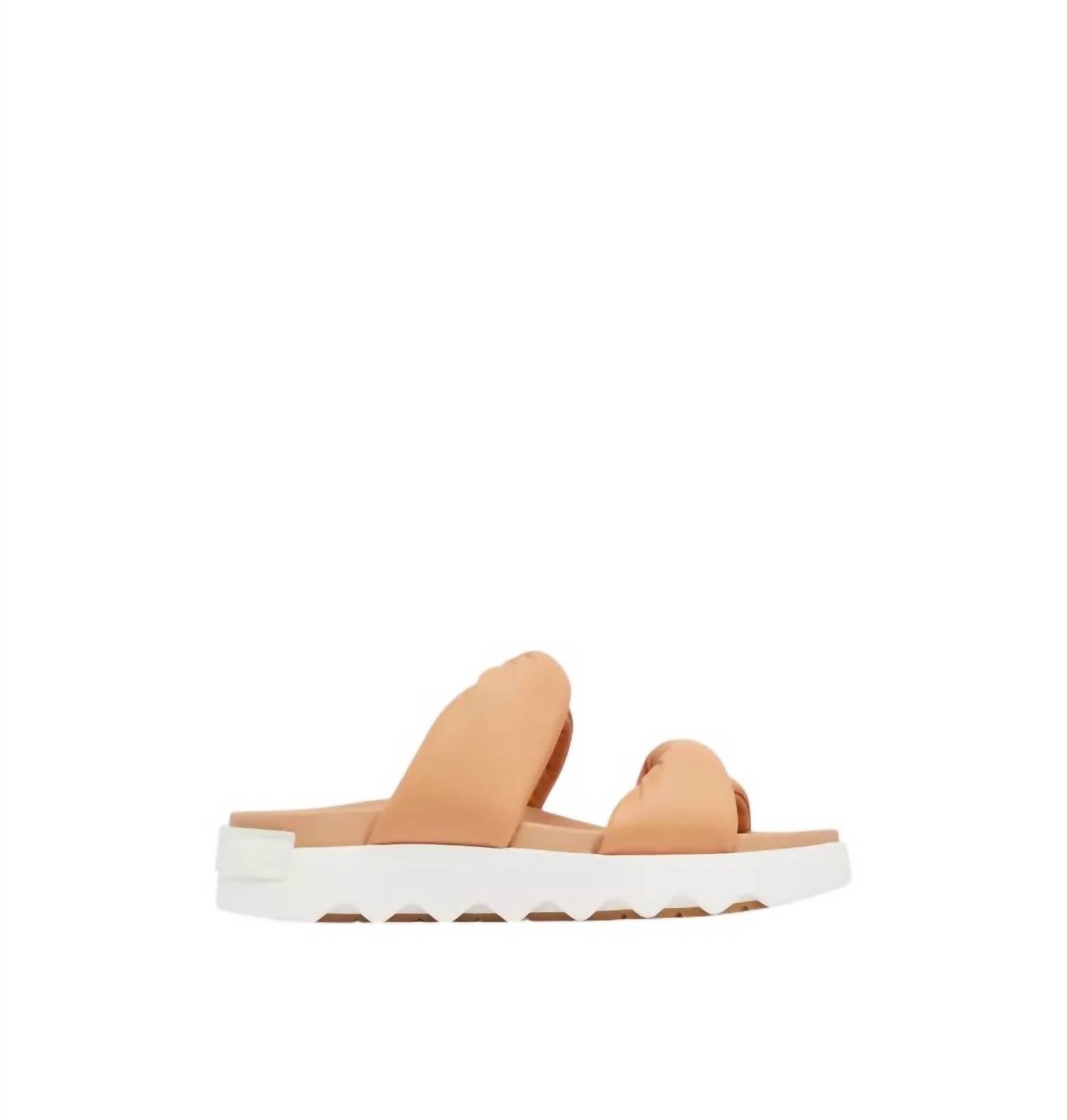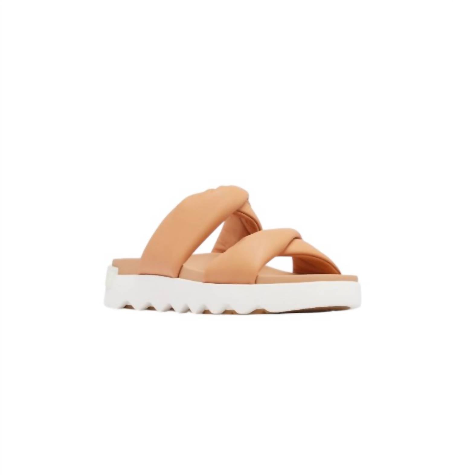 Flowy dresses, cropped pants, and even jumpsuits... this sandal works with them all! Experience a blend of style and comfort with the Women's VIIBE Twist Slide Flat Sandal by SOREL. Made with leather material, these sandals feature a chic twist strap design in Honest Beige and Sea Salt. The 1" white platform sole provides a subtle lift while ensuring stability and support, perfect for a day out or a casual stroll. Enjoy a soft, luxurious feel with the leather lining and a convenient slide-on style for effortless wear.