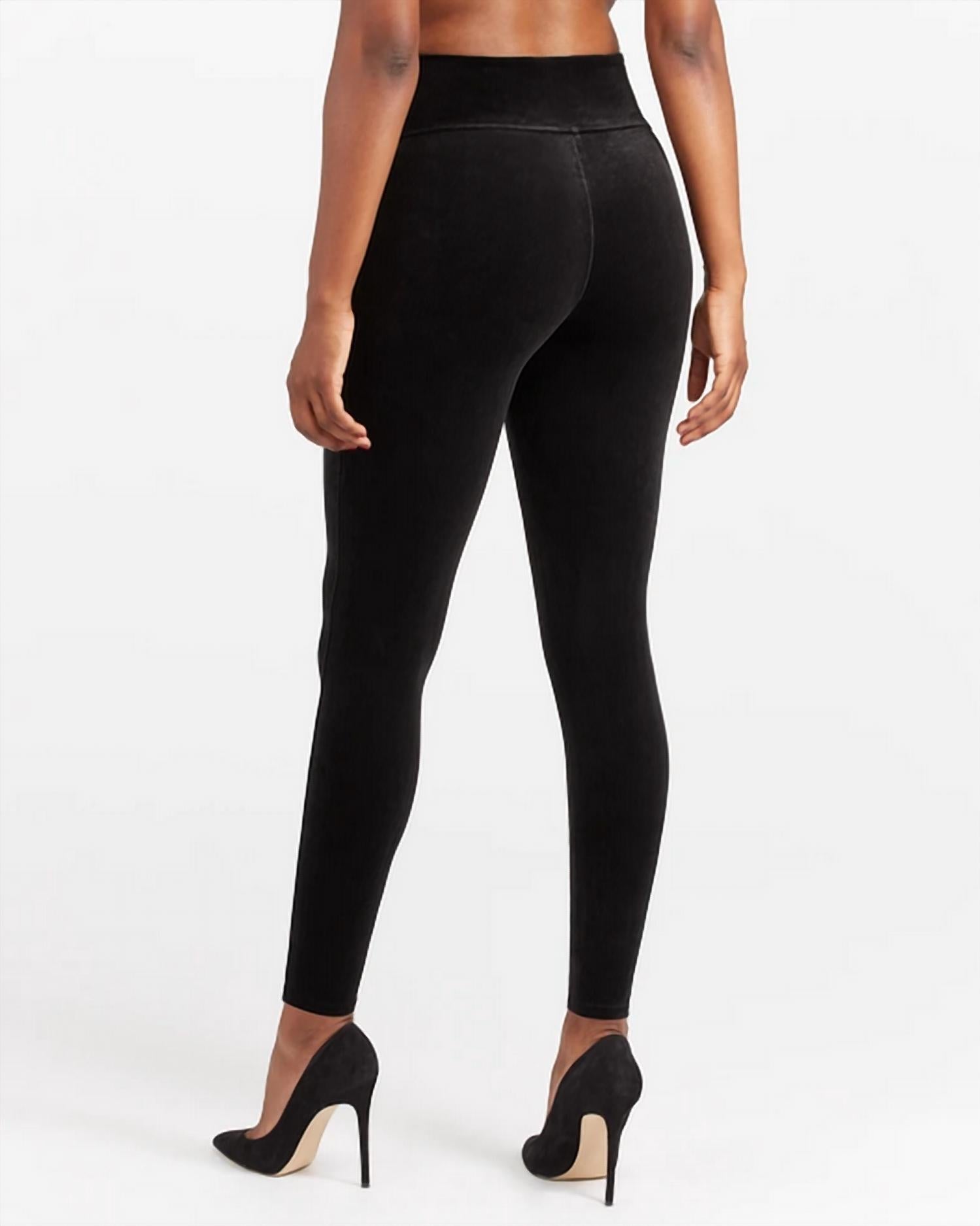 The legging you didn't know you needed and you won't want to take off. Elevate your wardrobe with the Velvet Legging by Spanx, a luxurious staple in a sleek black hue. These leggings feature a high-rise, pull-on closure design ensuring comfort and style for any occasion. Crafted with a blend of 91% polyester and 9% elastane for the body, and a lining of 80% polyester and 20% elastane, they offer a slimming fit with a skinny leg silhouette. For care, simply machine wash on a gentle cycle inside out and lay flat to dry without ironing.