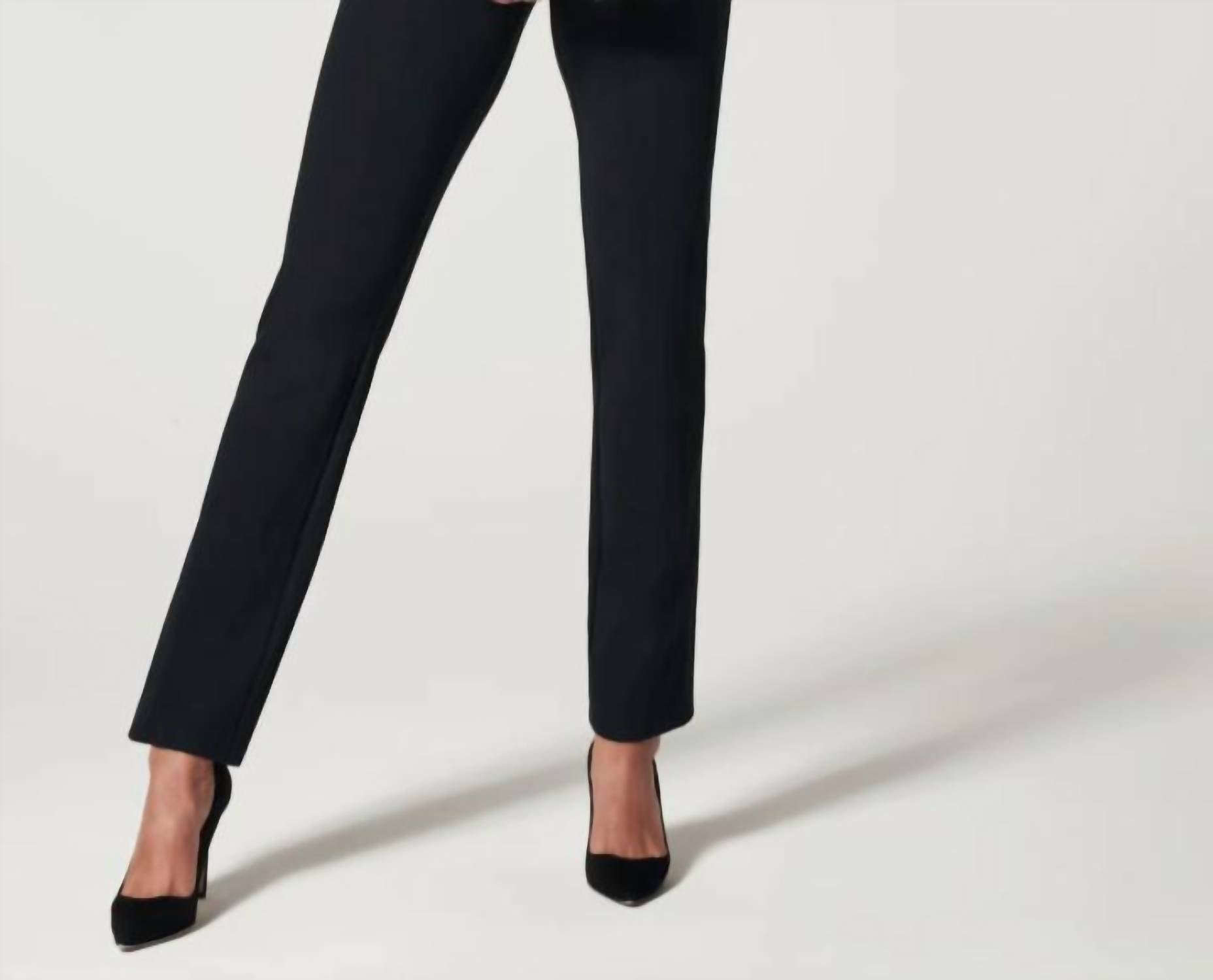 A perfectly tailored straight leg that you'll want in every color! Elevate your wardrobe with the Women's The Perfect Pant Slim Straight by Spanx, crafted in classic black for a timeless look. Made from premium ponte fabric offering four-way stretch and hidden core shaping technology, these pants provide both comfort and a sleek silhouette. Designed with a straight leg, they hit at the natural waist and feature a booty-lifting effect, ideal for day-to-night wear. Origin: Imported. Closure: Pull on. Care: Machine wash cold, gentle cycle, line dry, and low iron if needed.