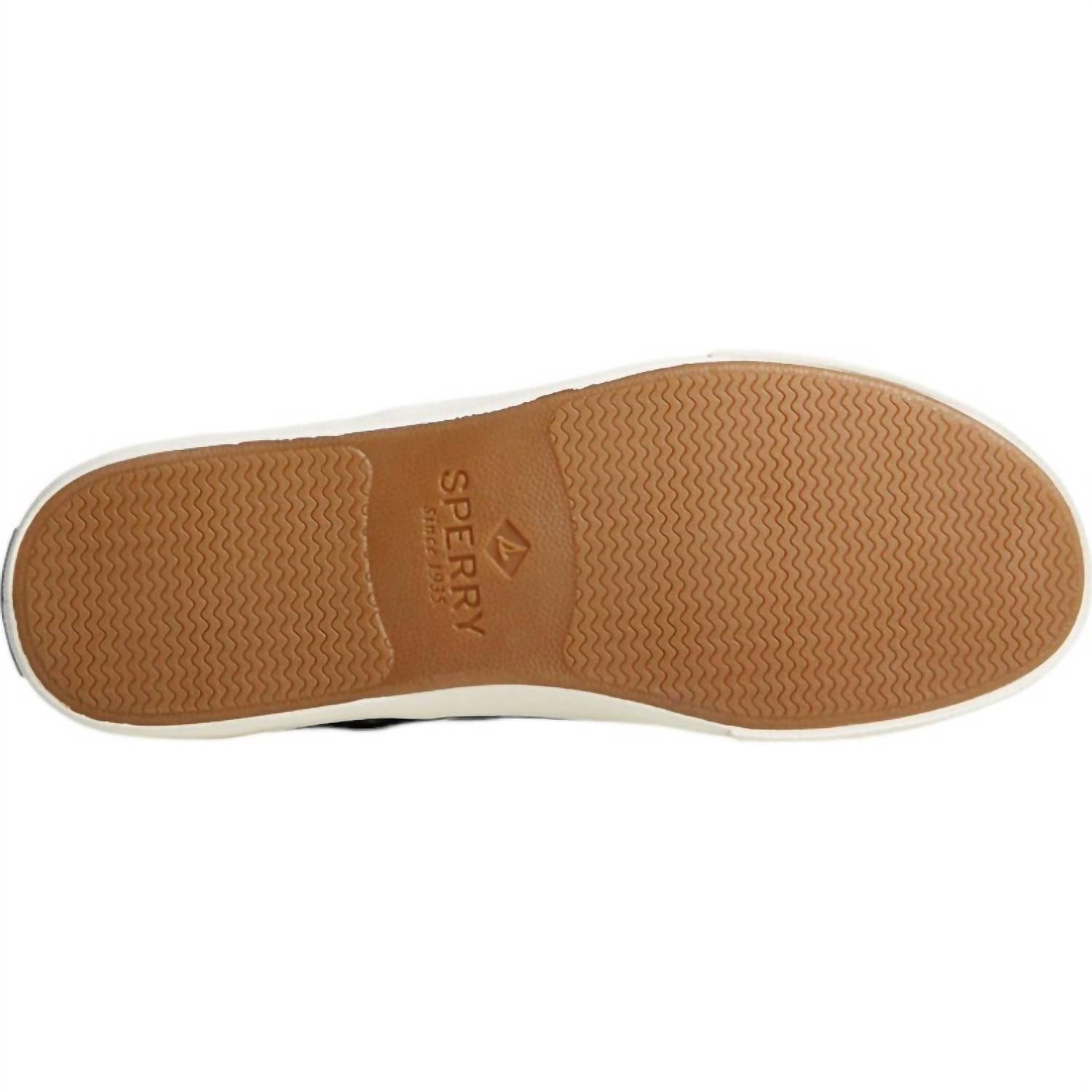Step into timeless style crafted to blend modern sustainability with classic design. Featuring a refined navy hue. Effortlessly elevate any casual ensemble. Upper, made from a partially recycled cotton blend. Underscores a commitment to eco-conscious fashion. Signature rawhide laces introduce a touch of maritime flair. Innovative hidden gore construction ensures easy slip-on comfort without compromising on fit. Boast a flat heel and round toe for all-day ease. Catering to both medium and wide fits. Part of the SeaCycled™ Collection. 65% recycled cotton upper. Metal eyelets contain 70% recycled material. Signature rawhide laces. Hidden gore construction for easy on/off. Non-marking rubber outsole with molded Wave-Siping™ technology for enhanced traction.