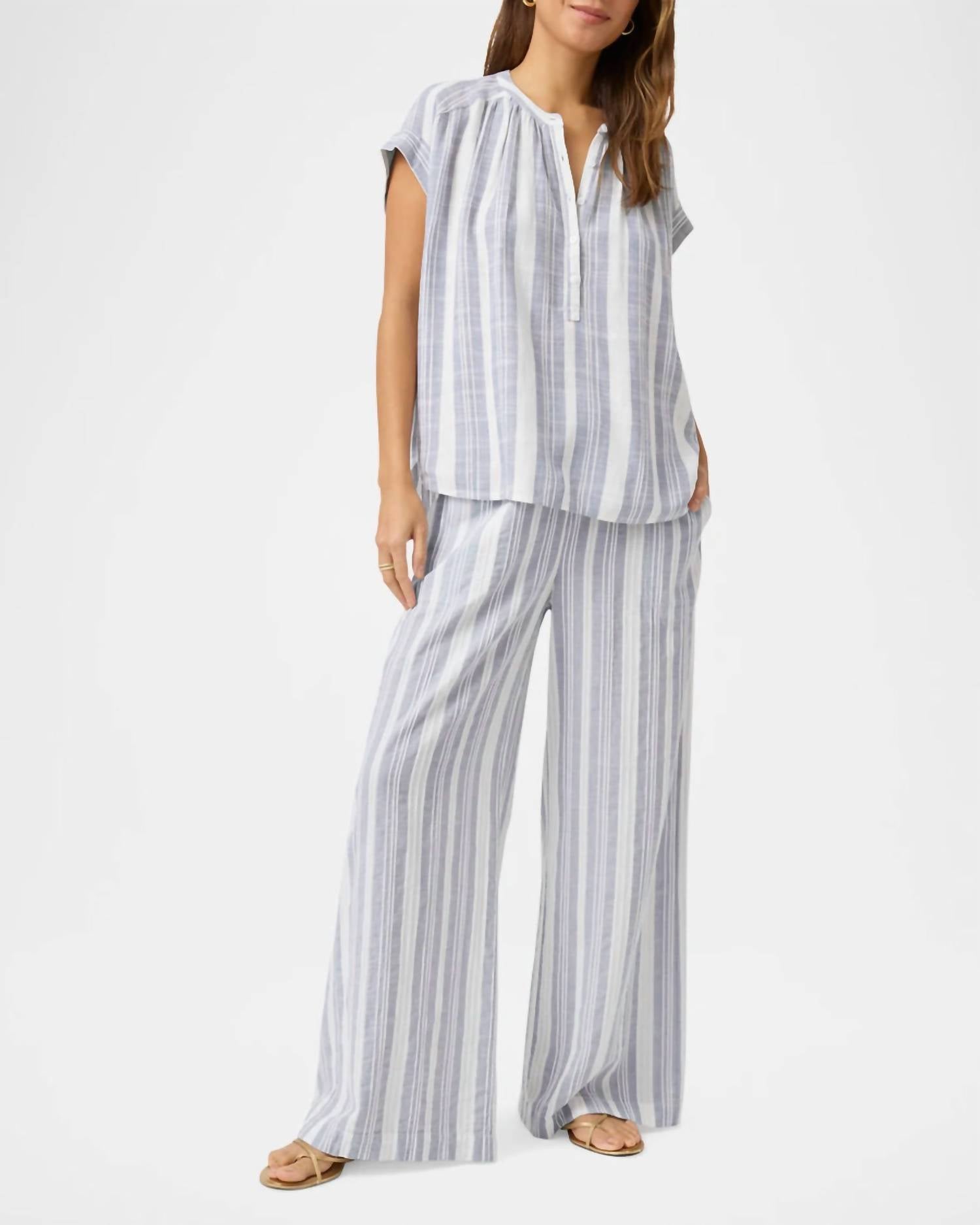Pair this with your favorite jeans and slides for your next girls night out. Embrace effortless summer style with the Raegan Stripe Blouse by Splendid, featuring short sleeves and a soft, drapey fit. Crafted from a blend of 84% viscose and 16% linen, this blouse boasts a striped design in white and seaport hues. Its V-neck and button half placket add a touch of coastal charm, perfect for pairing with the Raegan Pant or your favorite denim. Closure: Button closure. Care: Hand wash and lay flat to dry. Ideal for vacation getaways, this minimalist piece brings a relaxed elegance to your summer wardrobe.