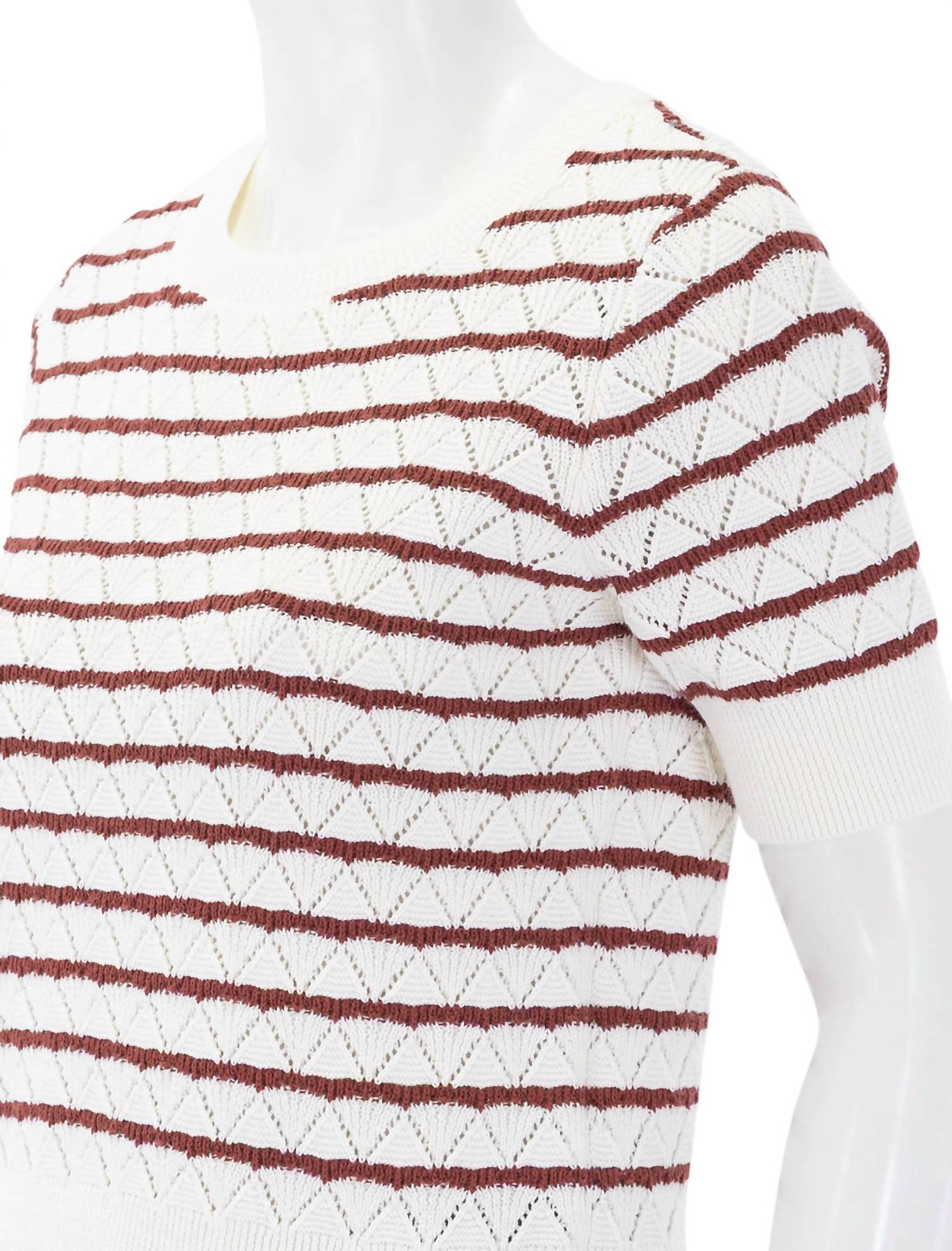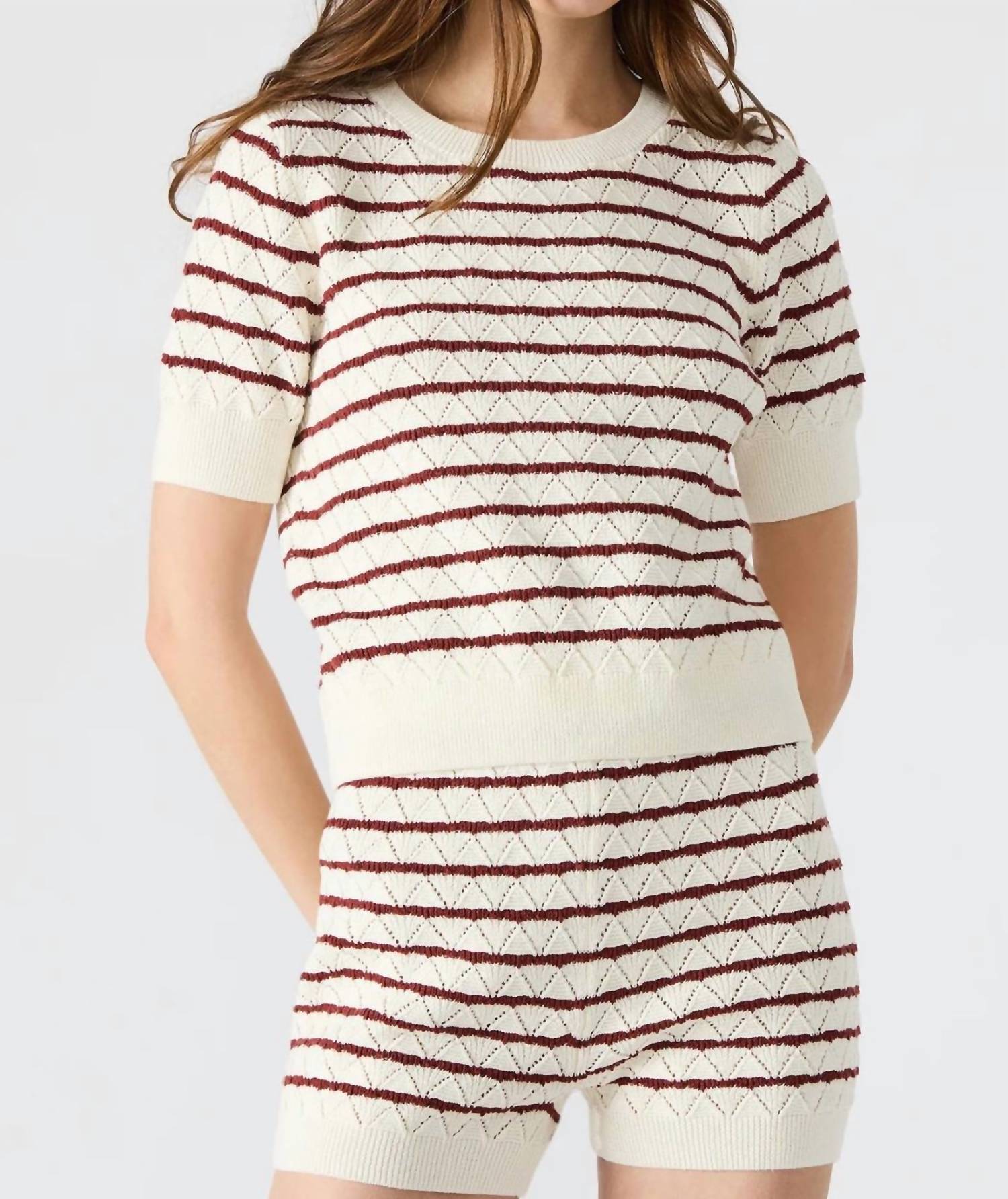 Introducing the Norris Short Sleeve Sweater by Steve Madden, a must-have for your fall wardrobe in a delightful Marshmallow hue. This women's sweater is crafted from a cotton blend, comprising 60% cotton and 40% polyester, and is designed with a stylish stripe pattern perfect for vacation settings. It features a crewneck and short sleeves with a convenient pull-on closure. For lasting quality, hand wash and lay flat to dry.