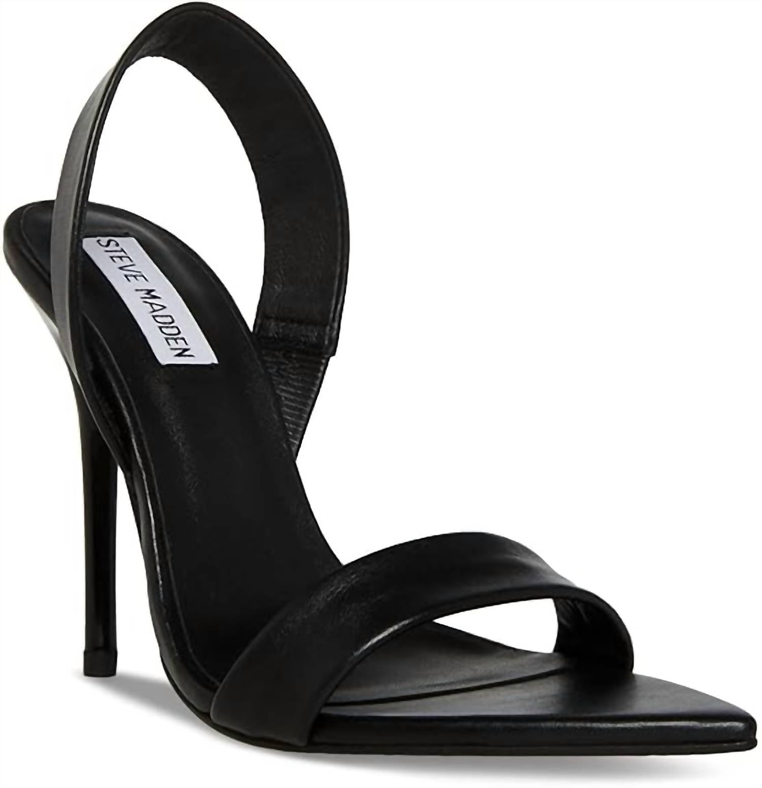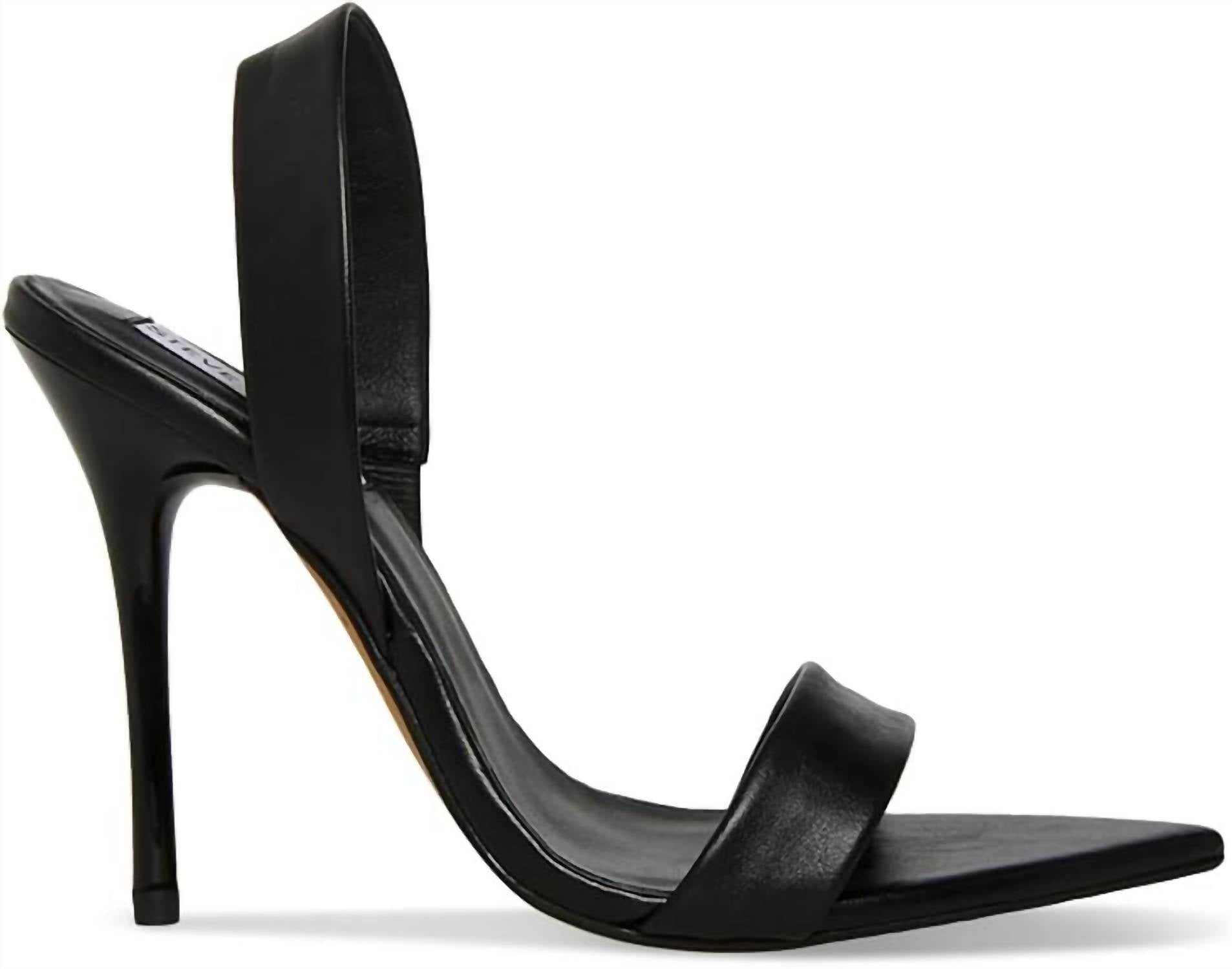 This sandal will take you from brunch to dinner and everything in between. Introducing the Women's Batali Sandals by Steve Madden, a chic addition to any wardrobe with their sleek black leather construction offering both comfort and style. These sophisticated sandals feature a high stiletto heel, over 3 1/4 inches, creating an elegant silhouette perfect for any occasion. The pointed toe shape adds an extra touch of refinement. Ideal for adult women seeking a fashionable yet timeless look.