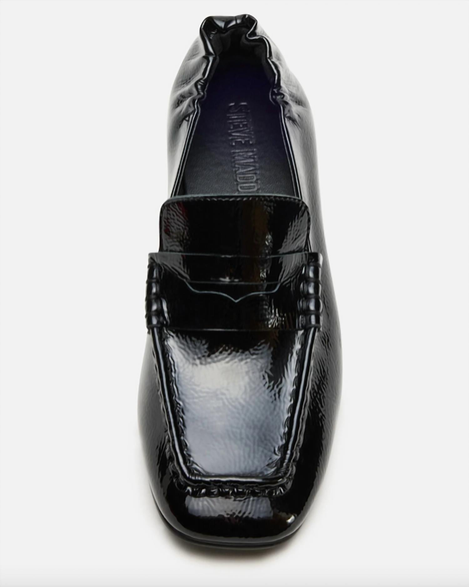 Introducing the Women's Estee Crinkle Shoes by STEVE MADDEN, a chic choice for workwear. Crafted from black patent leather, these shoes feature a 1.75-inch block heel, ideal for spring engagements. With a comfortable synthetic lining, sock, and sole, each pair is thoughtfully designed for all-day wear. Imported for quality assurance, these shoes blend style and comfort effortlessly.