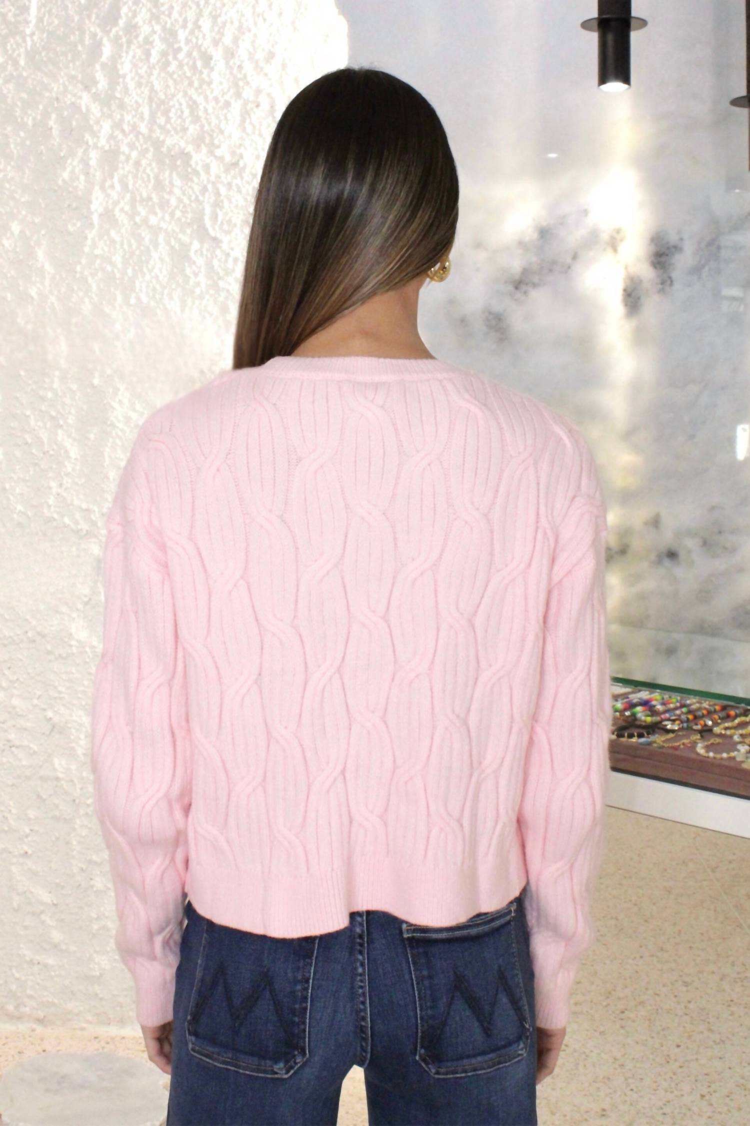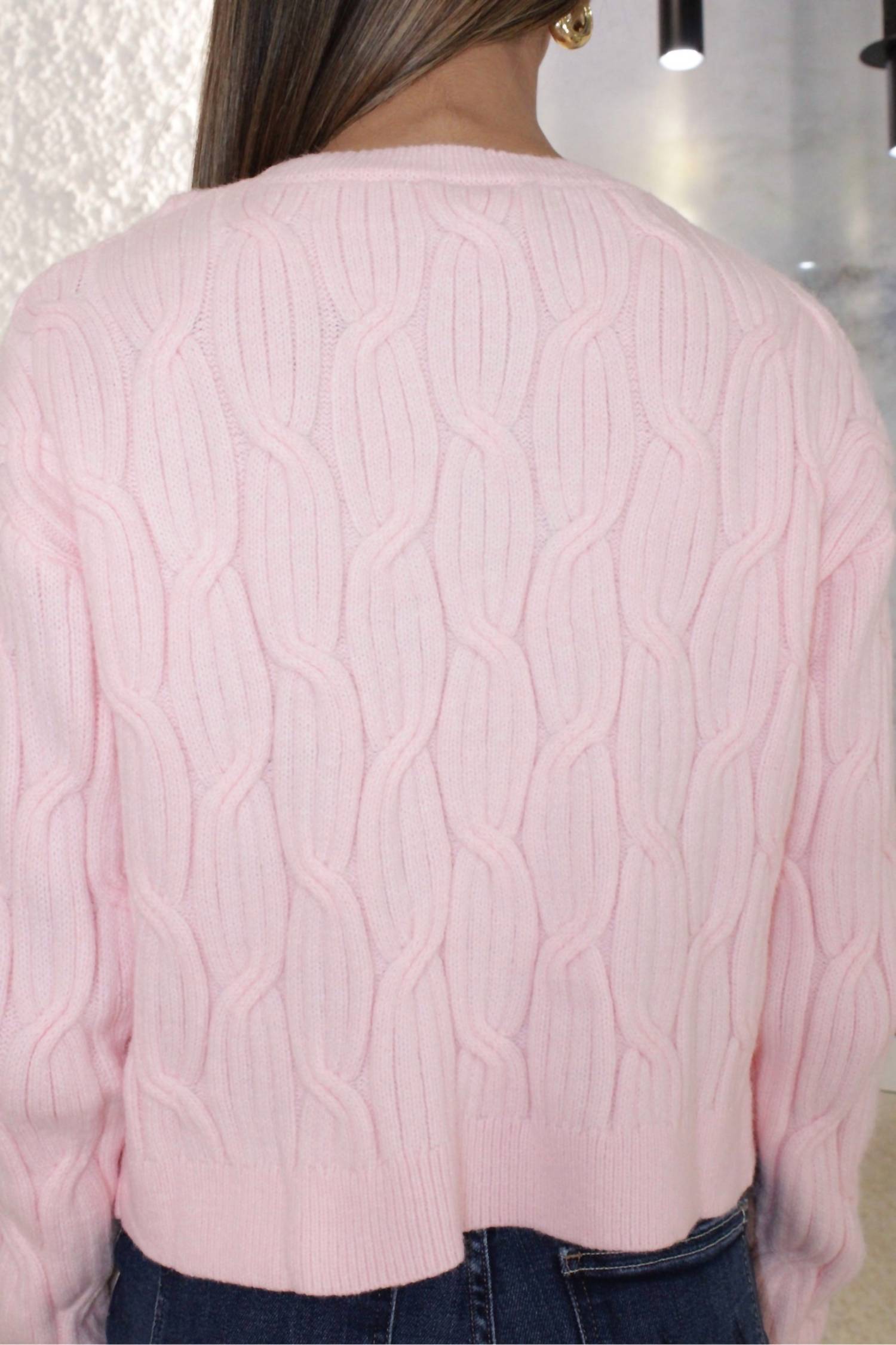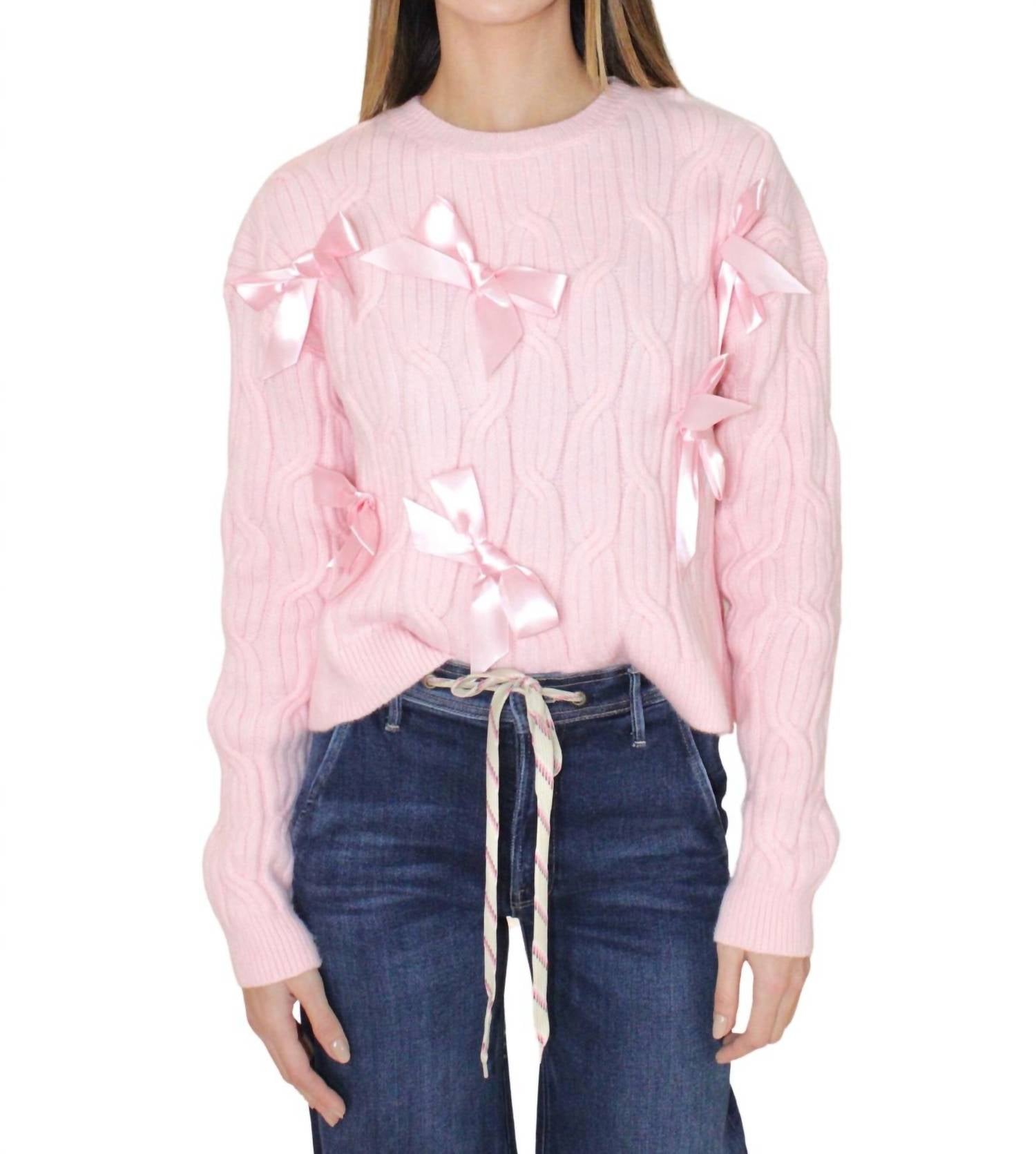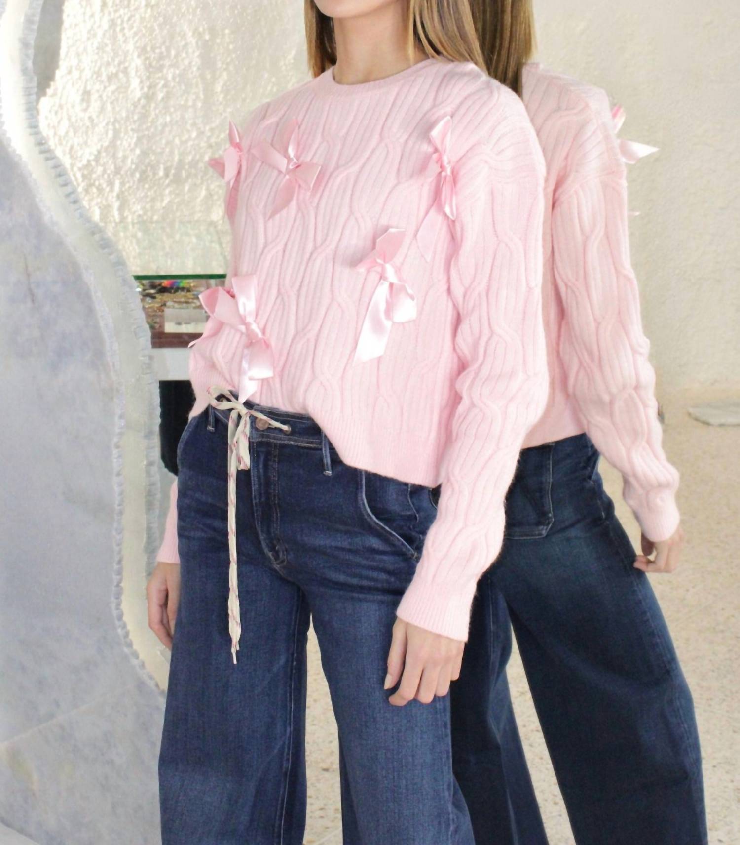 Introducing the Bow Cable Knit Sweater by STORIA, an elegant piece in a soft baby pink hue designed for both comfort and style. Crafted from a blend of 58% Acrylic, 27% Polyester, and 15% Nylon, this mid-length sweater features long sleeves and is adorned with shiny pink bows for a touch of feminine charm. With a timeless cable knit design and a classic crewneck, it offers warmth without sacrificing on trendiness. Pull-on style. Hand wash and lay flat to dry.