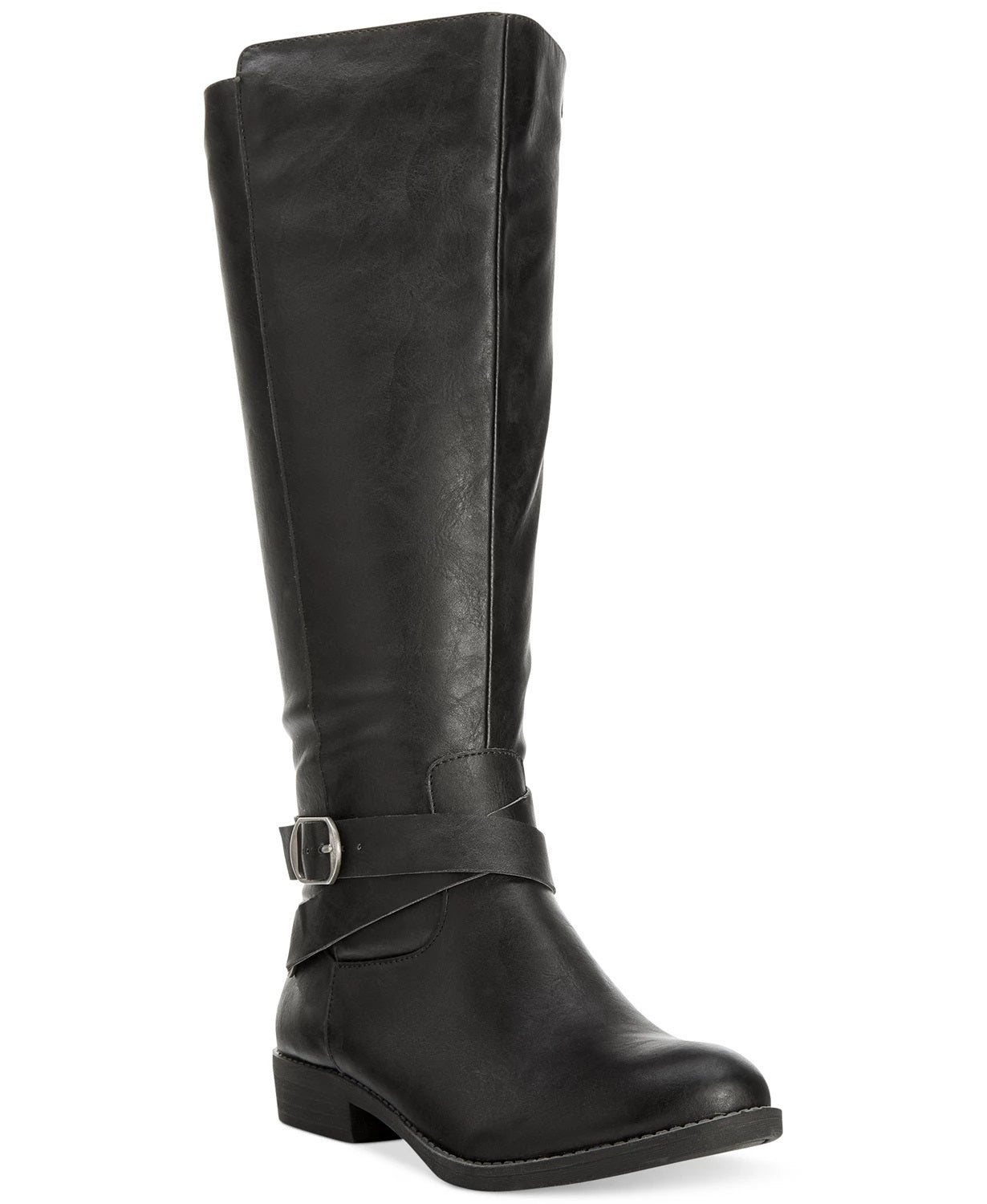 1" faux-stacked heel|Round-toe riding boots with full side zipper; crisscrossing ankle strap and buckle detail|Please note: Shaft height and circumference may vary by size.|Wide-Calf Options available for this style on page 4789841|Manmade upper; manmade sole|Elastic gore at full side zipper
