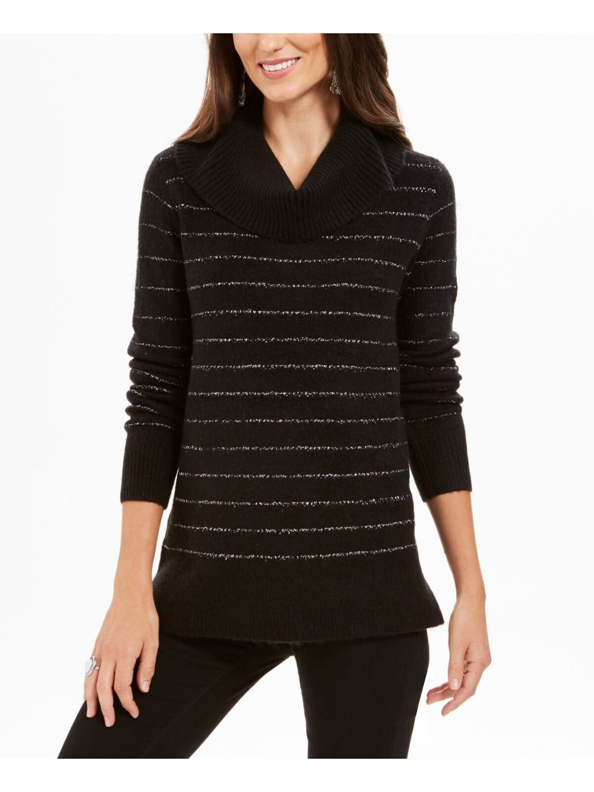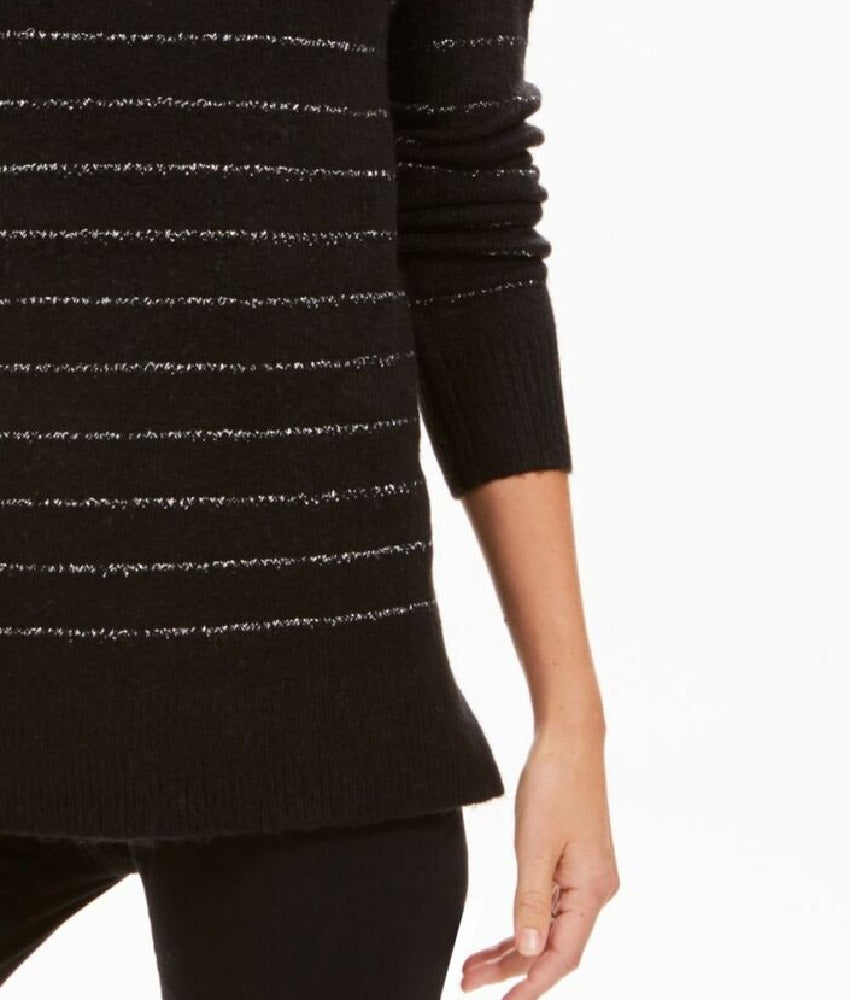 Designed to fit and flatter 5'4 and under frame|Turtleneck|Metallic stripes; ribbed at edges; vented hem|Acrylic/nylon/metallic/spandex|Machine washable