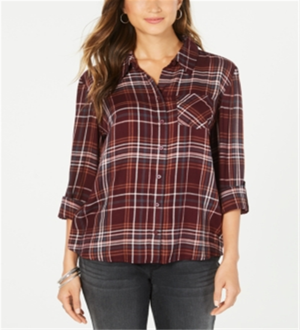 Style & Co Women's Plaid One Pocket Shirt Berry Size X-Small