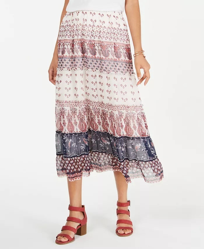 Style & Co Women's Tiered Mixed Print Midi Skirt Red Size Large
