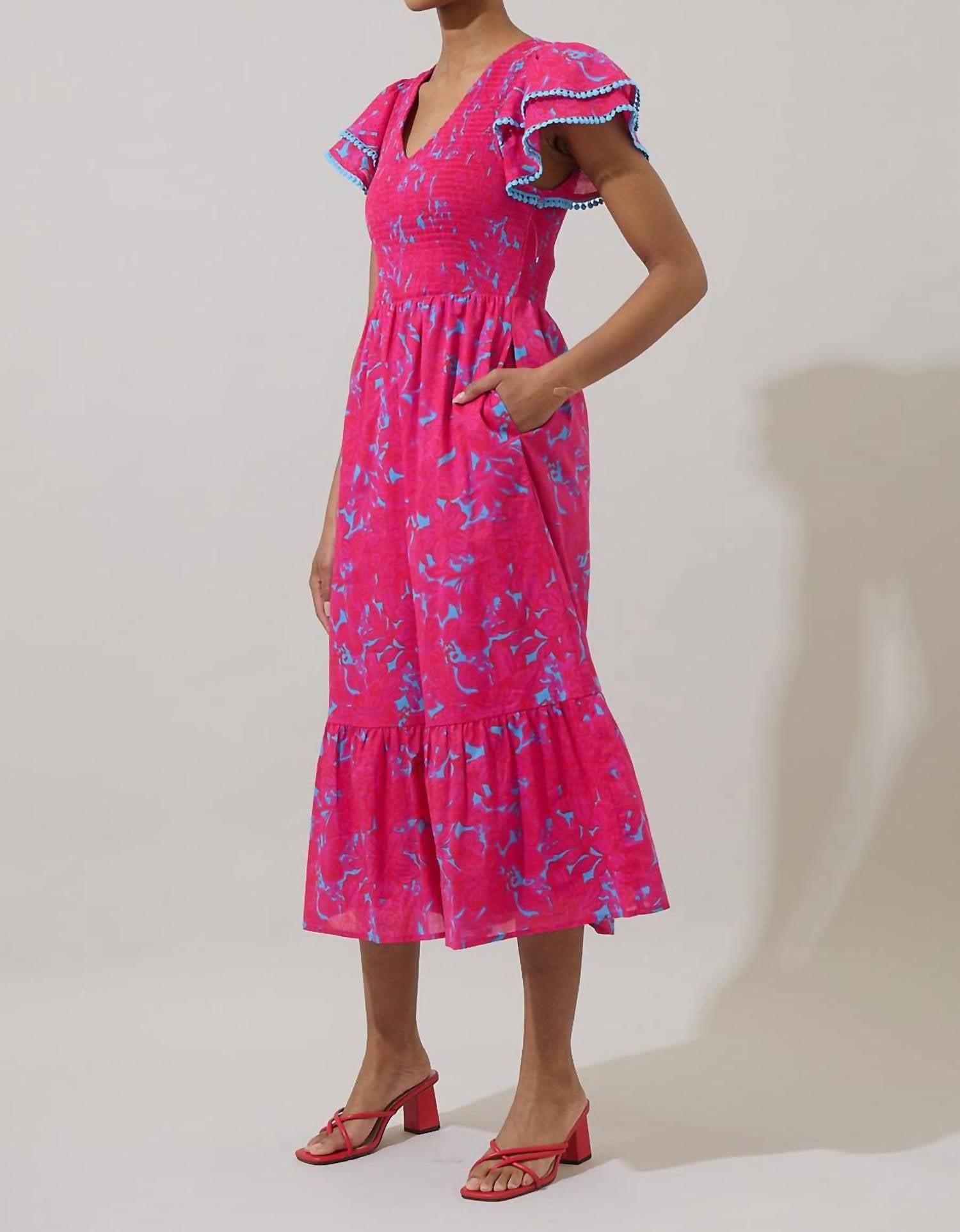 The perfect length dress does exist. Elevate your spring wardrobe with the Delina Floral Patte Tiered Midi Dress by SUGARLIPS, crafted in a 100% Cotton for breathable comfort. This fit-and-flare dress features cap sleeves with playful pom pom trim, a chic V-neckline, and a smocked body for a flattering fit. Its vibrant pink and blue floral pattern makes it perfect for holiday parties, while the side pockets add a practical touch. The dress measures 49 inches in length and is easy to wear with its convenient pull-on style.