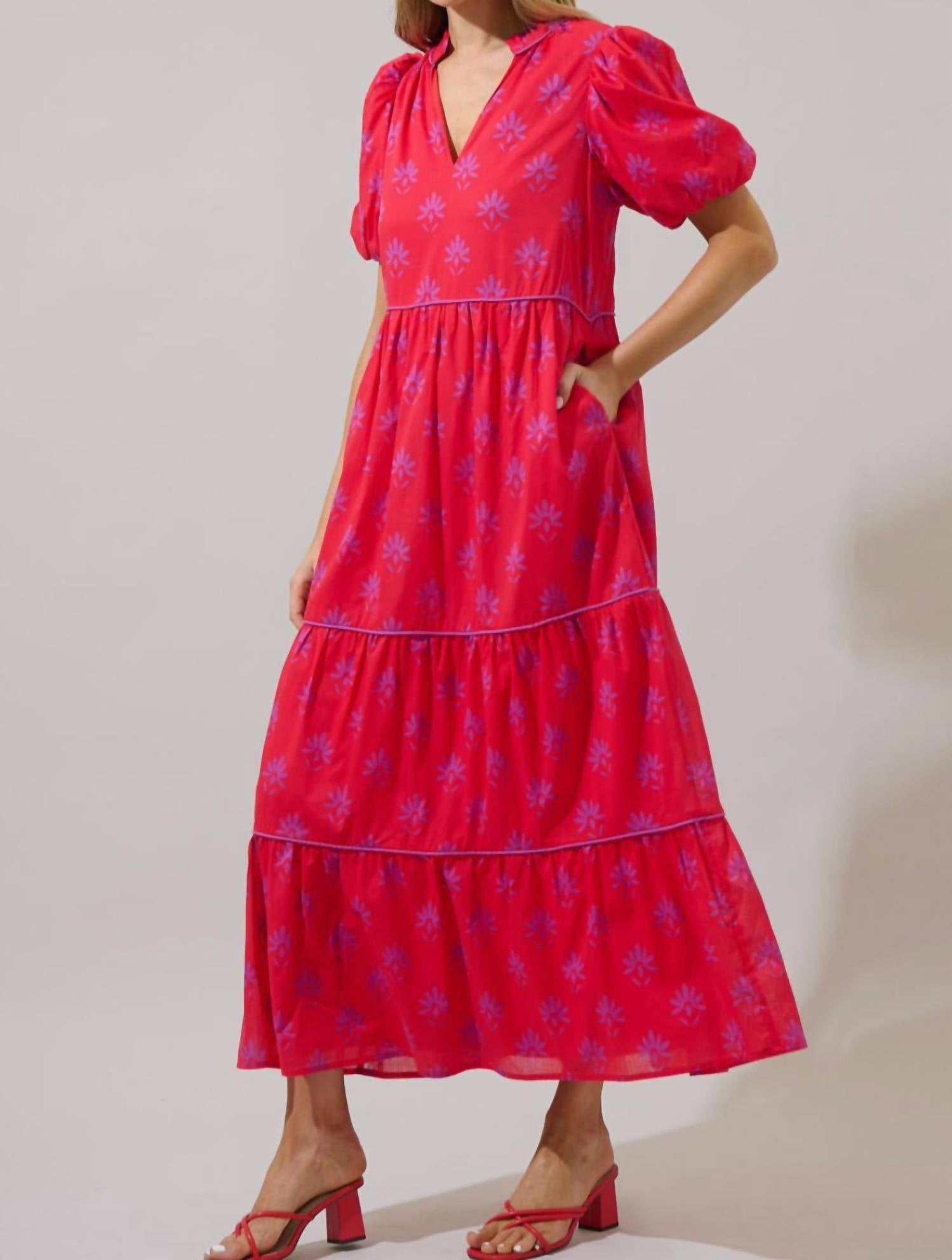 Style this maxi with your favorite statement necklace and sandals for the perfect look. Enhance your summer wardrobe with the SUGARLIPS Delmas Floral Renley Tiered Maxi Dress in Berry Purple, a boho chic masterpiece. This dress features short puff sleeves and a V-neck, showcasing a captivating floral pattern. Crafted from comfortable 100% Cotton with an A-line silhouette, it's designed to add flair with its tiered maxi length of 55.5 inches. Closure is pull-on, and it includes pockets for added convenience, making it a perfect choice for your next holiday party.