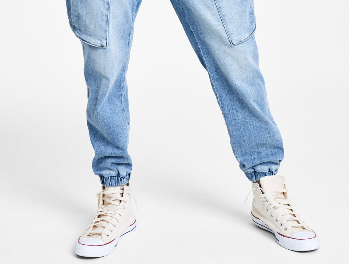 Keep your street-style comfortable with the super-soft denim and secure drawstring waistband of these Encinita cargo joggers from Sun + Stone.| Approx. inseam; 29| Mid rise| Regular fit | Drawstring waistband| Two side hand pockets; two cargo pockets at legs; two back welt pockets| Elastic cuffs