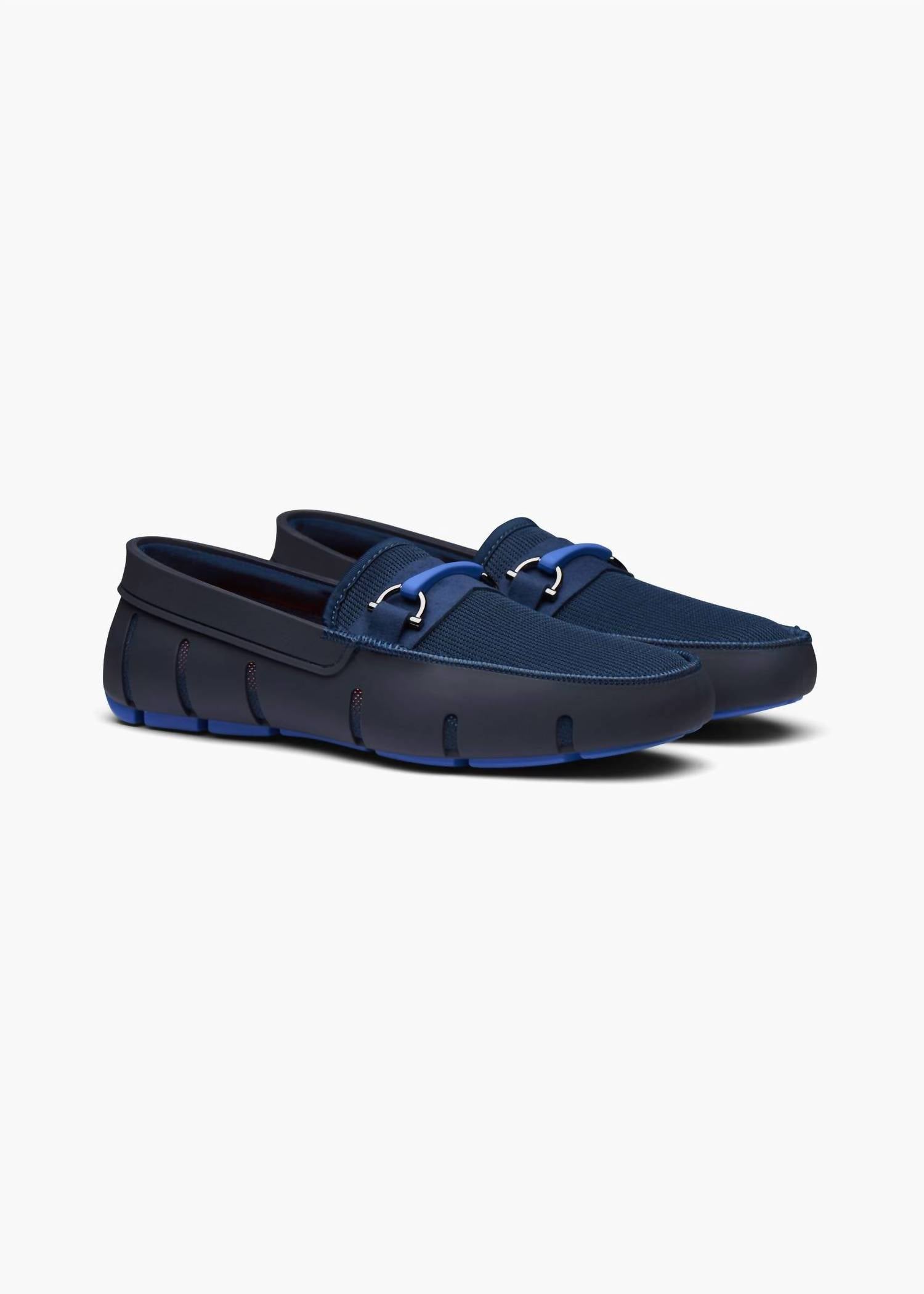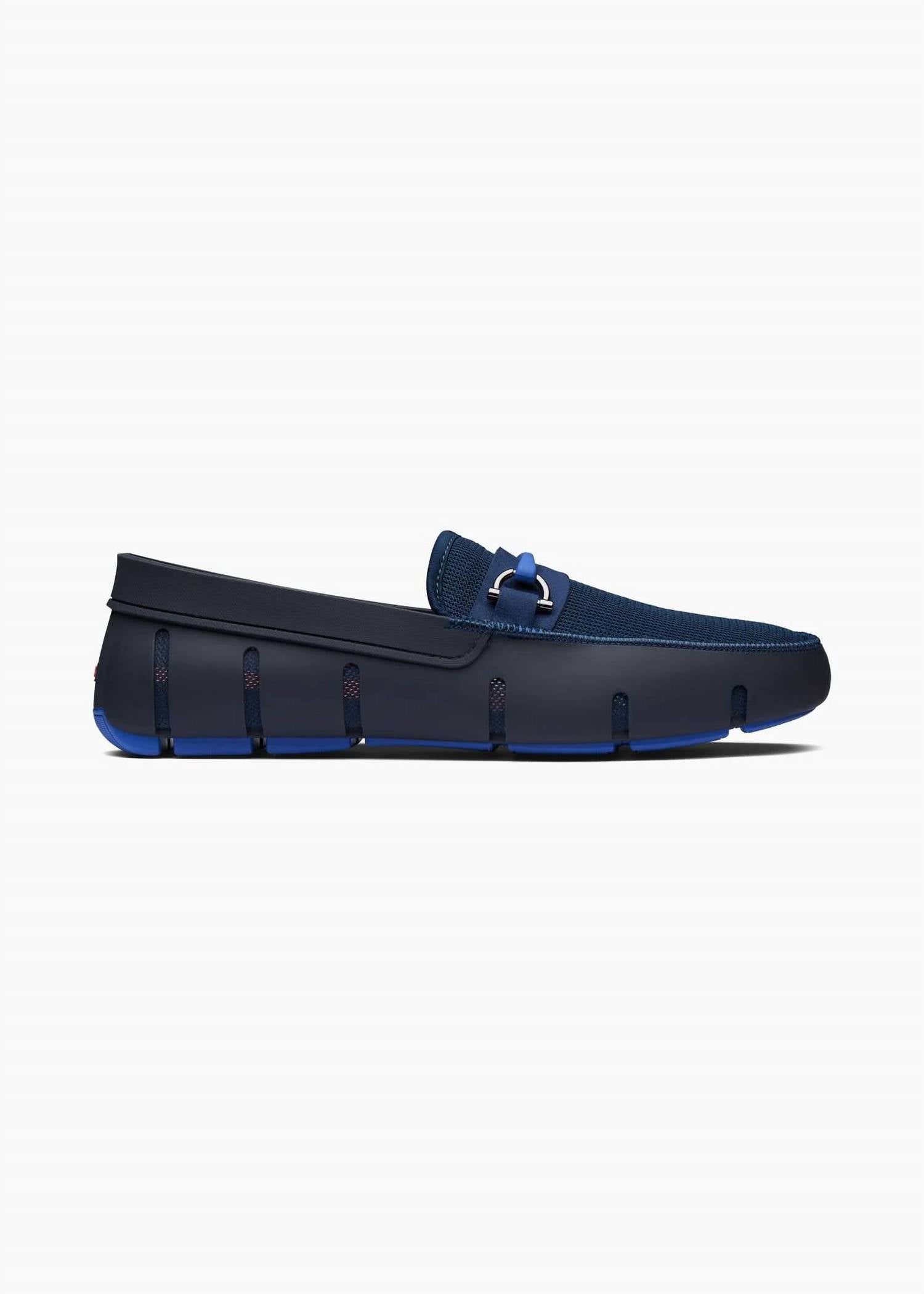 Step into modern sophistication with the Men's Sporty Bit Loafer by SWIMS, a vision in navy. Crafted with a vibrant rubber bit, it combines suede with knit materials for a fresher, contemporary aesthetic. This loafer is not only stylish but offers unparalleled breathability, lightweight comfort, and flexibility, making it ideal for travel during the summer season and perfect for Thanksgiving gatherings. The almond toe shape and flat heel provide a timeless silhouette, reimagined for today's fashion-forward man.