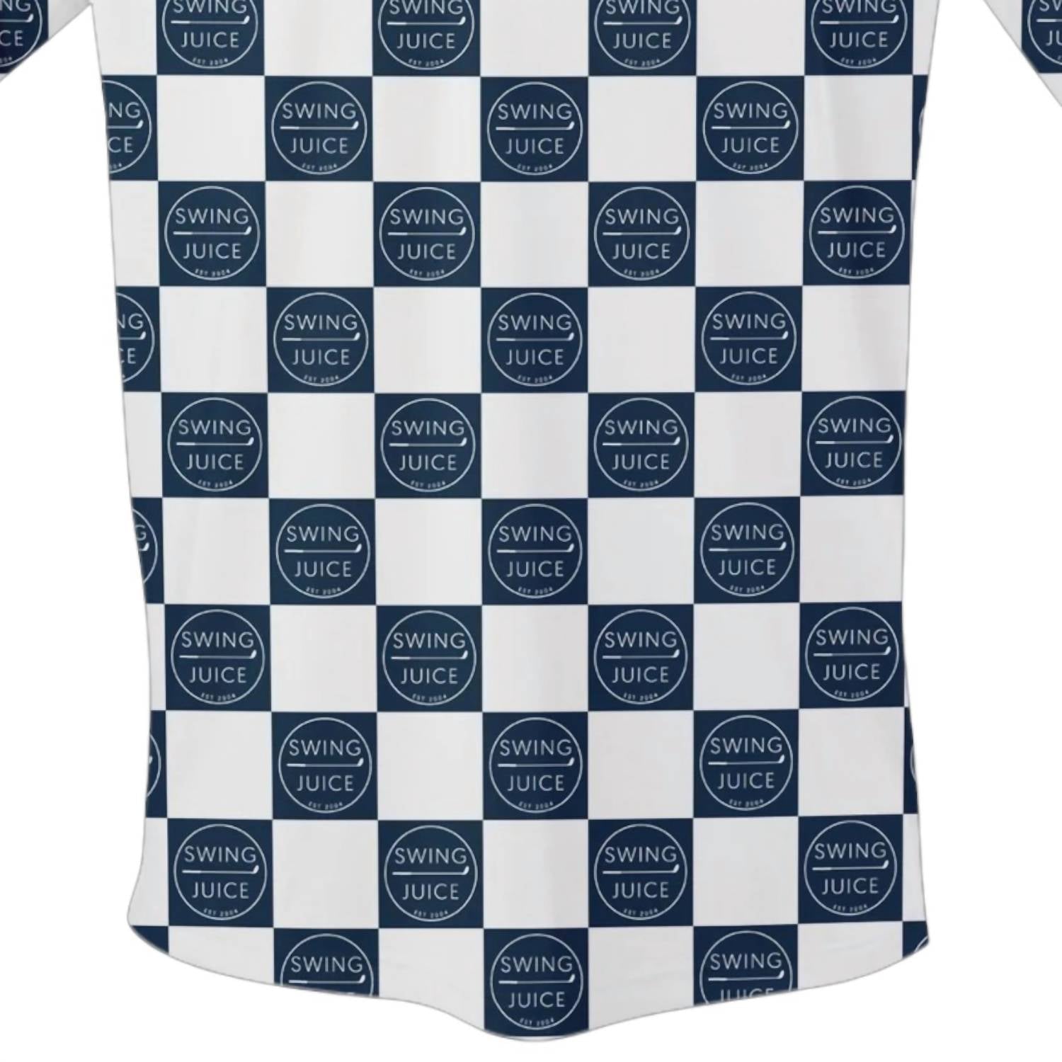 Introducing the Men's Golf SJ Checkerboard Polo Shirt by SwingJuice, a refined piece in navy designed for both style and performance. This polo features short sleeves with open cuffs and a three-button placket closure, complemented by a no-curl self-collar. Crafted from 92% micro polyester and 8% spandex, the bamboo charcoal infused fabric is not only naturally odor resistant but also offers UPF 50+ sun protection. Care is easy with machine wash cold and tumble dry low instructions, ensuring this polo maintains its quality on and off the course.
