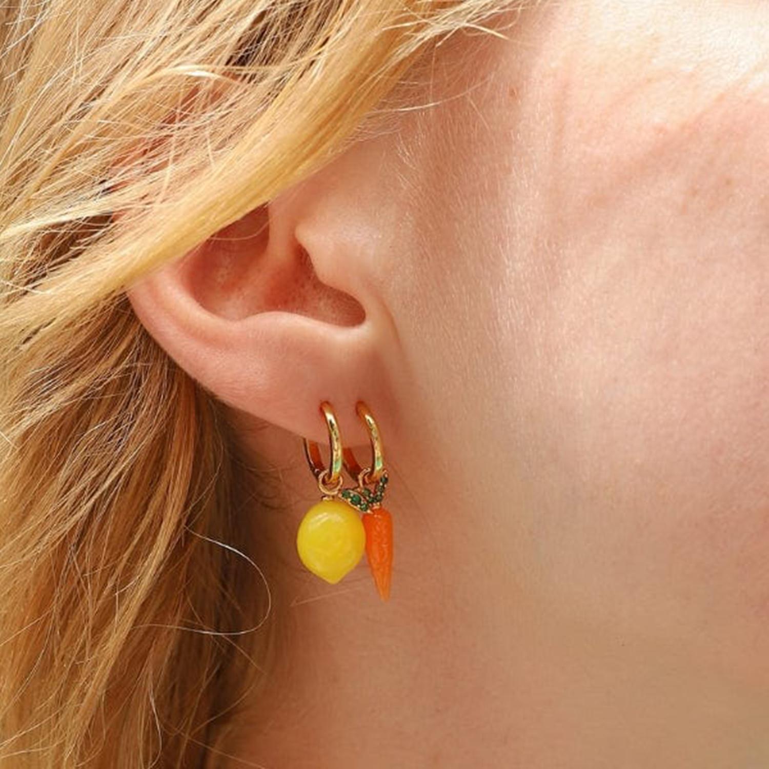 Classic earrings that will take you from season to season. Add a whimsical touch to your ensemble with the Carrot Charm Huggie Earrings by TAI. Crafted from brass with gold plating, these vibrant earrings flaunt charming carrot-shaped charms adorned with cubic zirconia and green enamel tops. Measuring 28.6mm in length and 5.5mm in width, with a 12.5mm huggie outer dimension, they offer a playful twist to any outfit. Closure: Huggie.