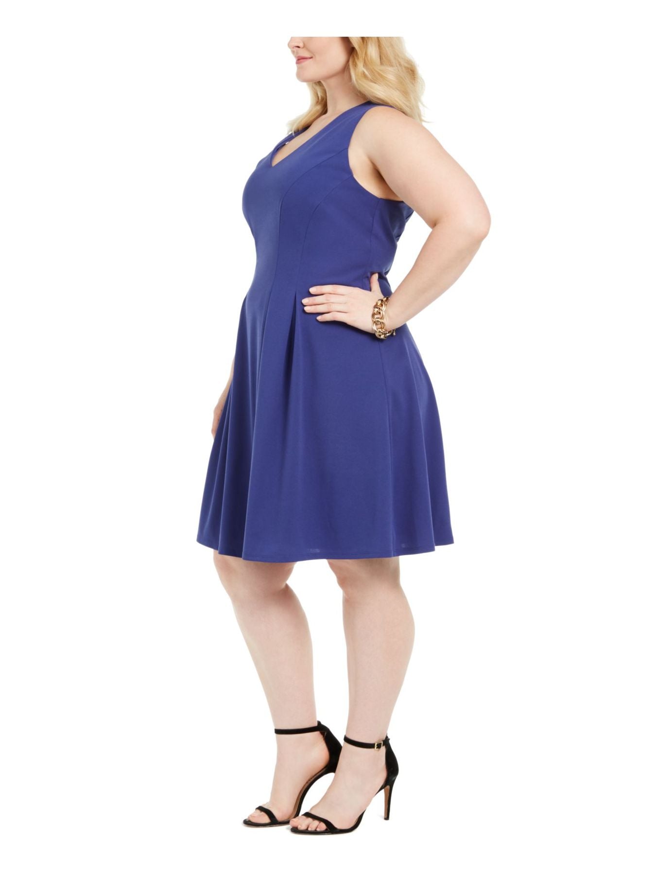 Approx. 42" long from center back neck to hem and varies 1/2" between sizes|V-neck; fit & flare silhouette|Back zipper closure|Pleated at front|Polyester/spandex; lining: polyester|Machine washable