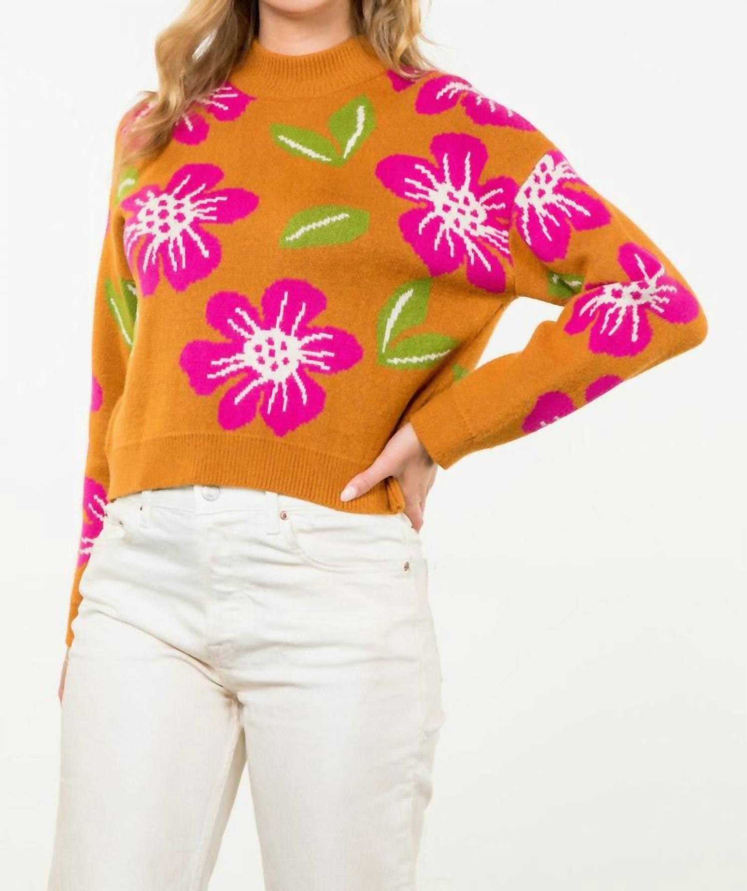 Stay warm and stylish in this versatile and effortlessly cool knitwear staple. Wear it alone or layered, it's the perfect sweater for the season and you'll wish you had it in every color. Crafted with long sleeves and a crewneck, this sweater features an oversized floral design for an effortlessly stylish look. Made from a blend of 43% Viscose, 32% Nylon, and 25% Polyester, it offers both comfort and durability. Pull on closure.