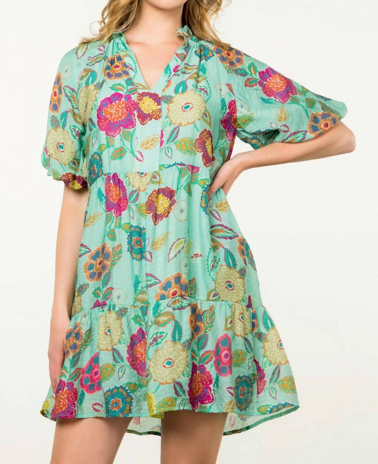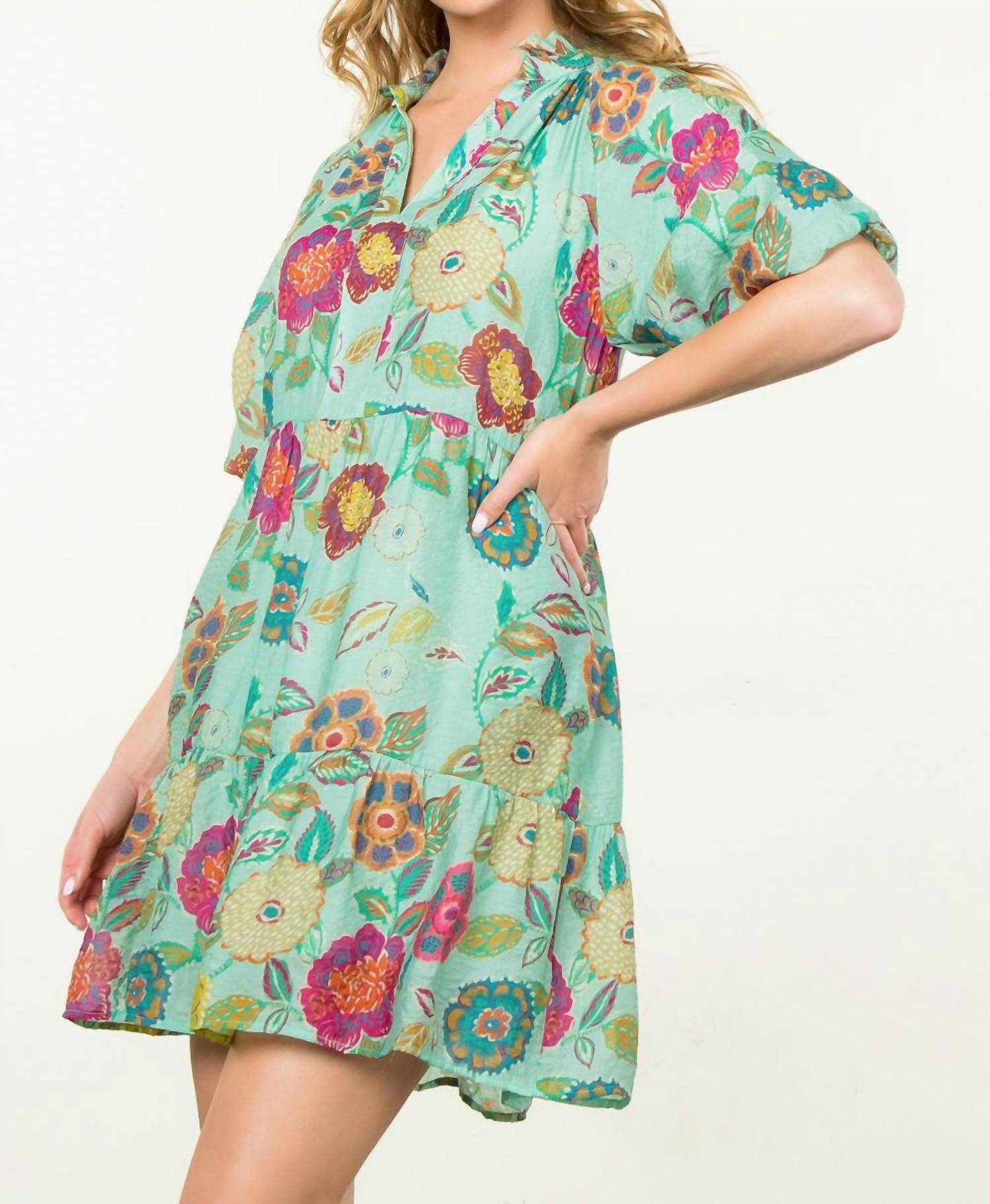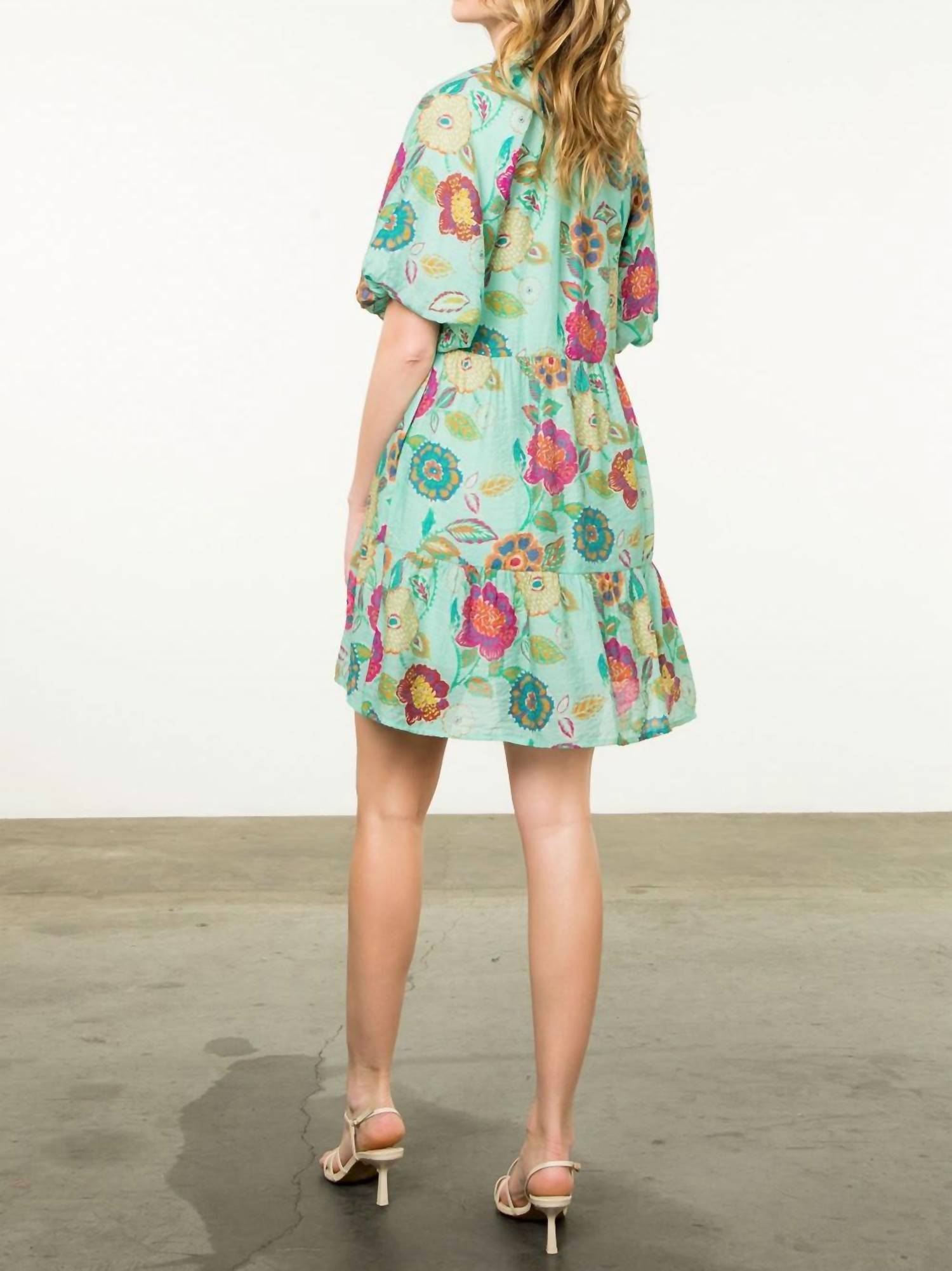 The Hibiscus Puff Sleeve Floral Dress by THML is a vibrant mini dress crafted for stylish women. With elbow-length puff sleeves and a mint floral print, this piece is perfect for spring. Made from rayon, it features a chic collar neckline and a convenient pull-on closure. Designed in the USA, it measures a 35-inch body length and 38-inch bust for size S, and includes pockets for added functionality. Machine wash recommended. Model wears size S, standing at 5'9" with measurements 32" bust, 25.5" waist, 36" hips. 80% Rayon, 20% Nylon.