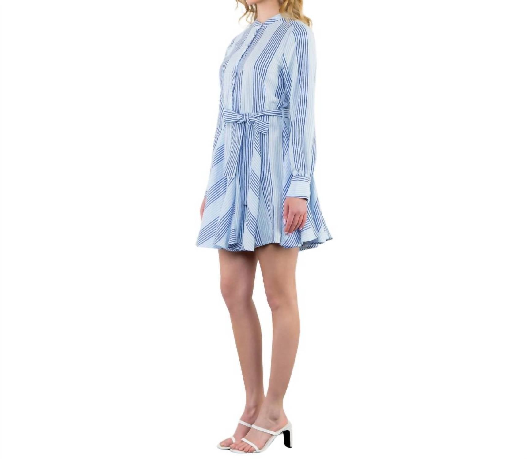 A short and breezy dress for those warmer days. Elevate your spring style with the THML Long Sleeve Striped Dress, a chic choice for any dinner party or Hanukkah celebration. Featuring long sleeves and a sophisticated mockneck design, this A-line mini dress in timeless blue stripes exudes elegant charm. Crafted from lightweight polyester, it offers comfort and style for summer gatherings. With a stylish button front and a flattering waist belt, this dress is a true wardrobe must-have.