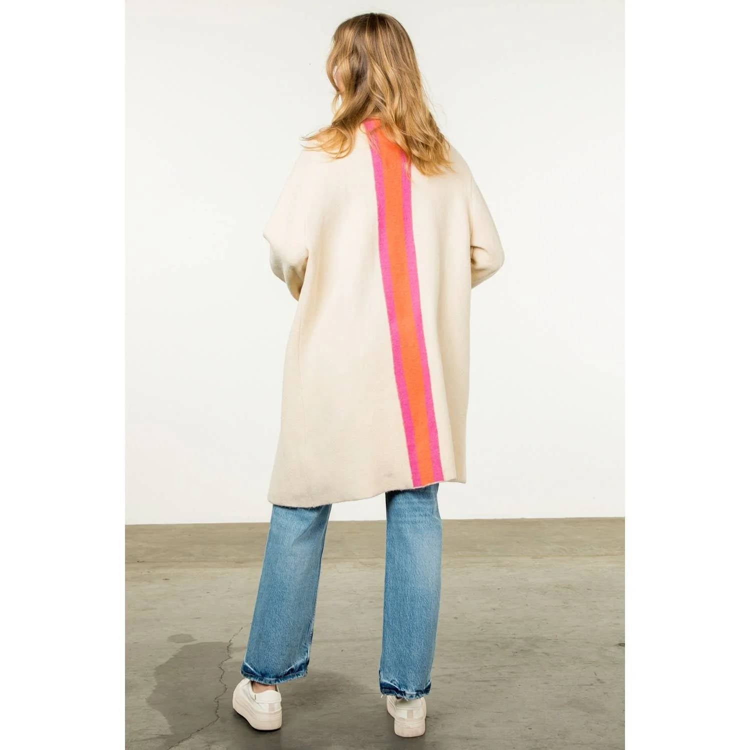 Introducing the Molly Cardigan by THML, a cozy essential for your wardrobe in a warm tan shade. This cardigan showcases a stylish stripe pattern in orange and navy on the back, making it perfect for layering through the seasons. Crafted with care and attention to detail, its versatile design ensures it complements various outfits with ease.