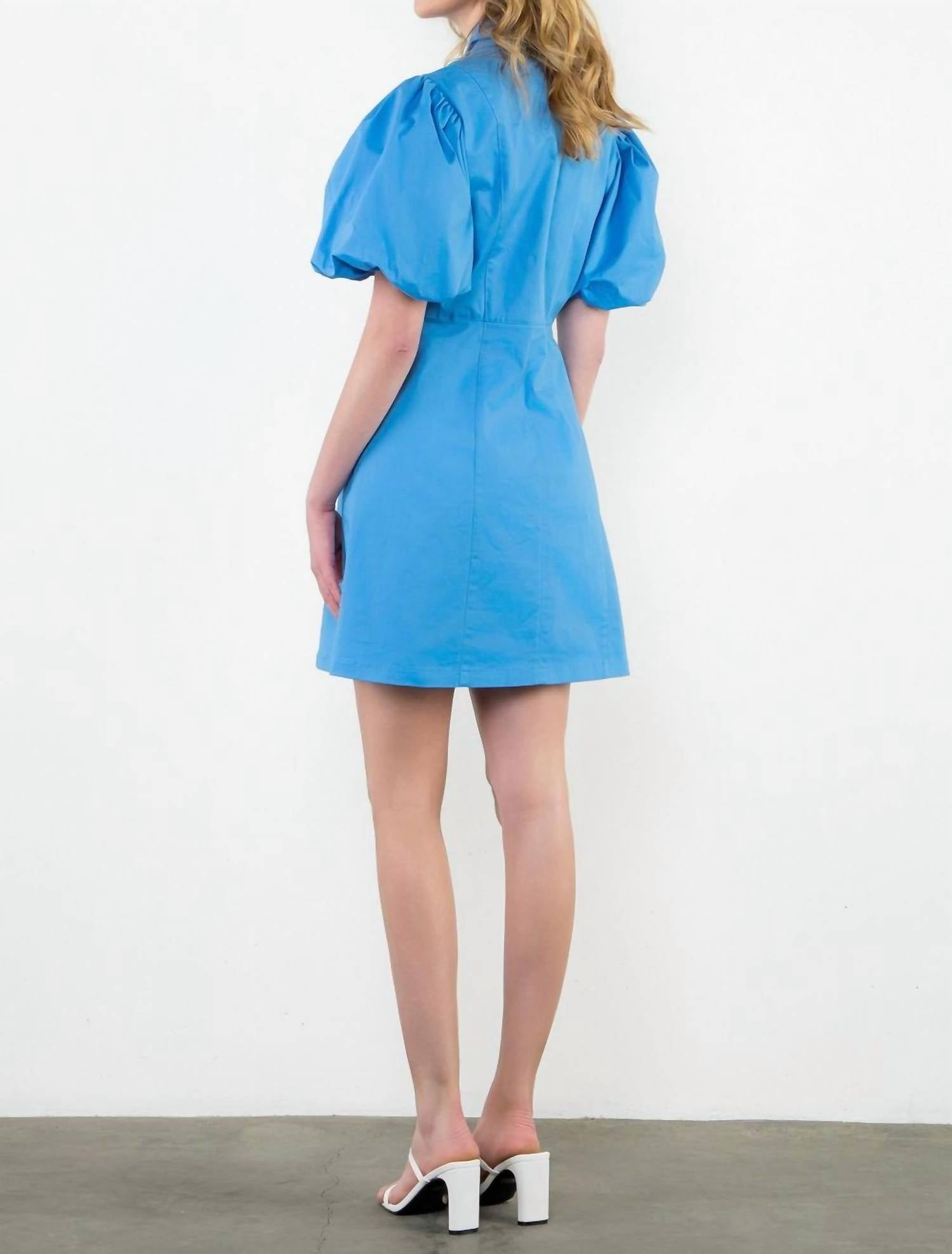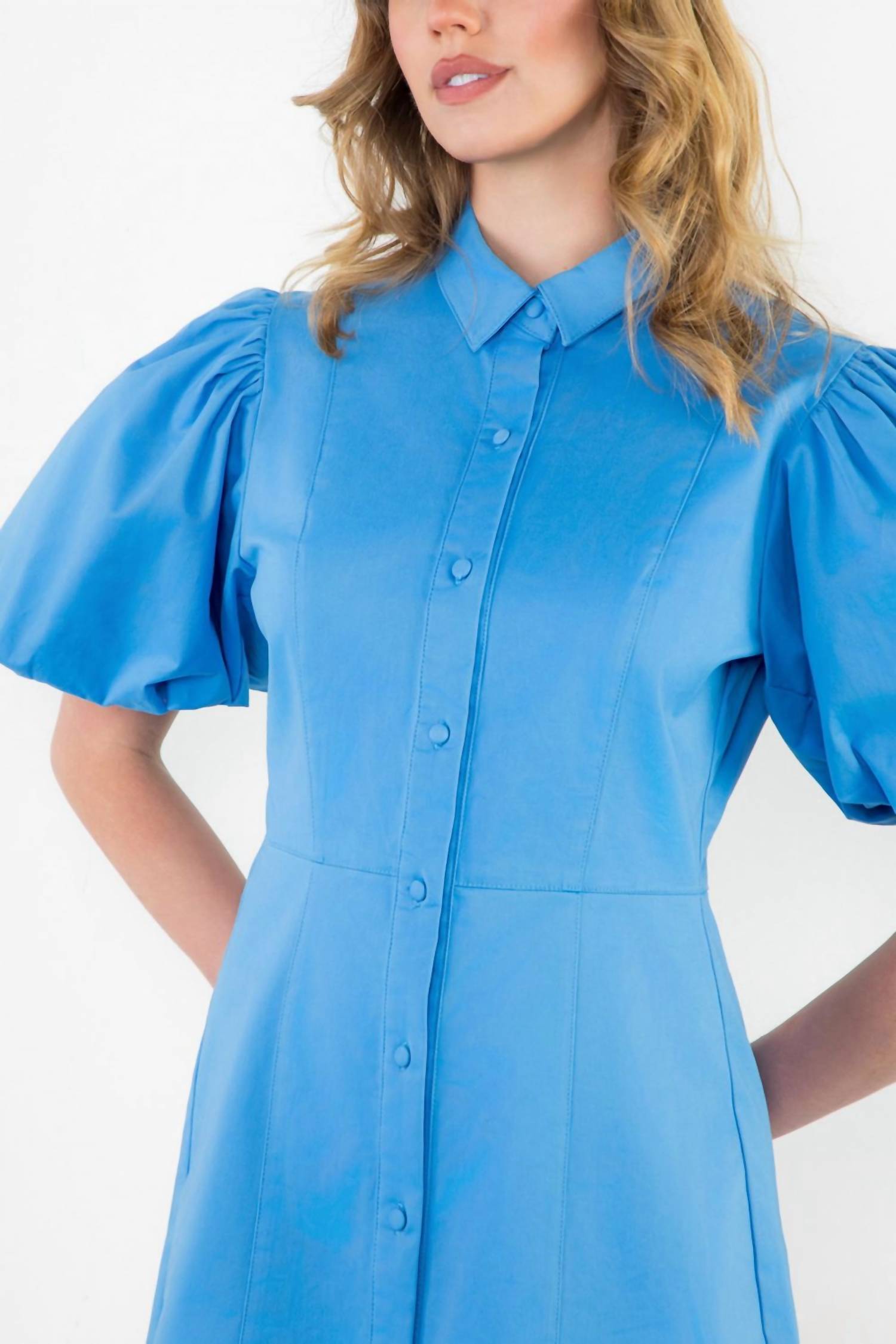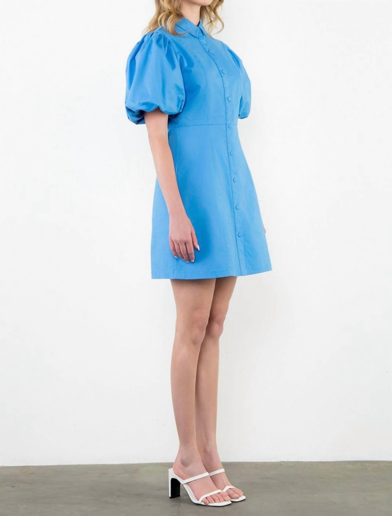 Step into elegance with the Puff Sleeve Button Up Dress by THML, crafted for your next dinner party. This chic A-line mini dress comes in a solid blue and features short sleeves for a fresh Spring look. Made in 100% polyester and fully lined, it perfectly combines comfort and style with a classic collar and convenient button closure. Available in sizes Small (Bust 17”, Hem 33”), Medium (Bust 18”, Hem 33”), and Large (Bust 19”, Hem 34”). Model height is 5’3”.