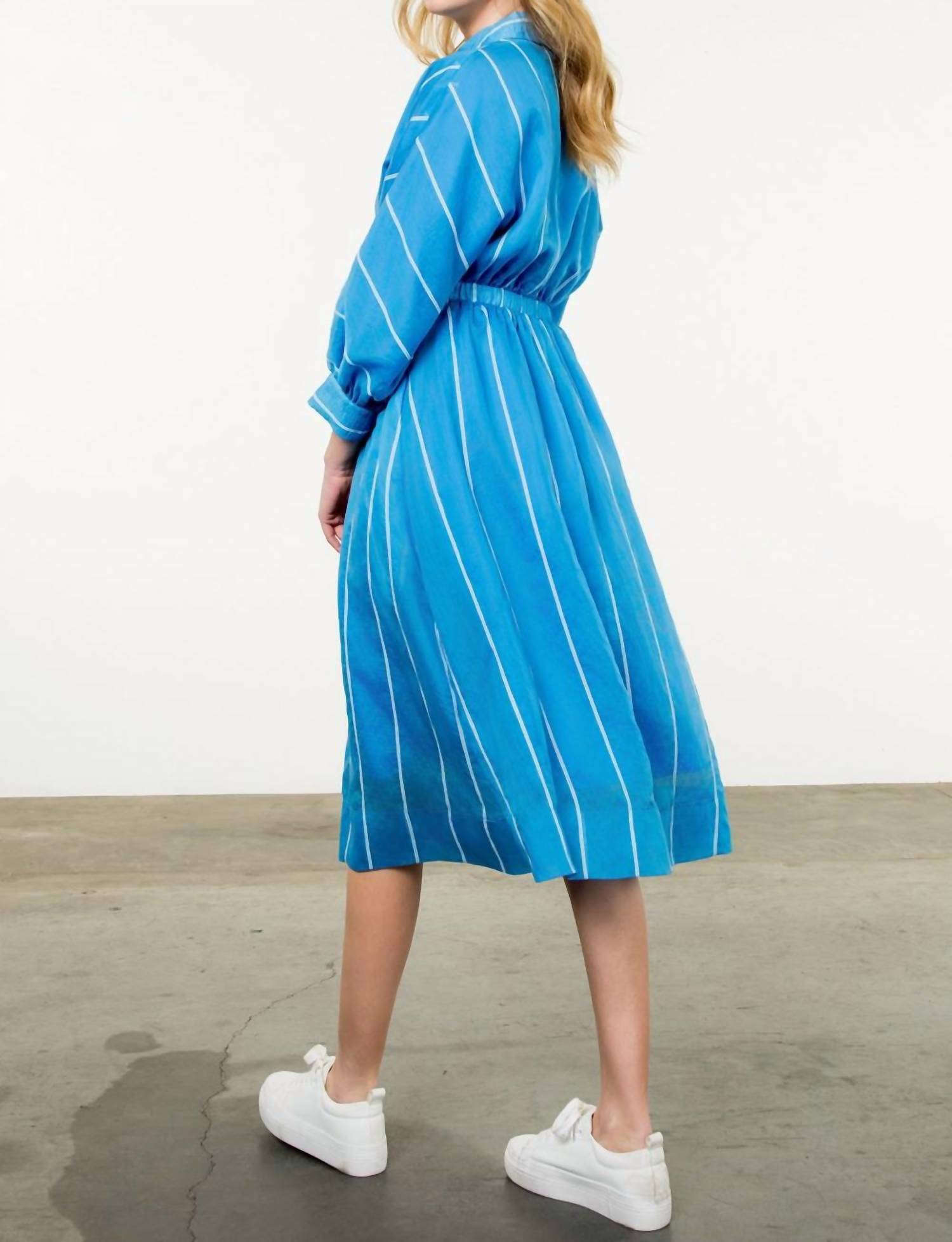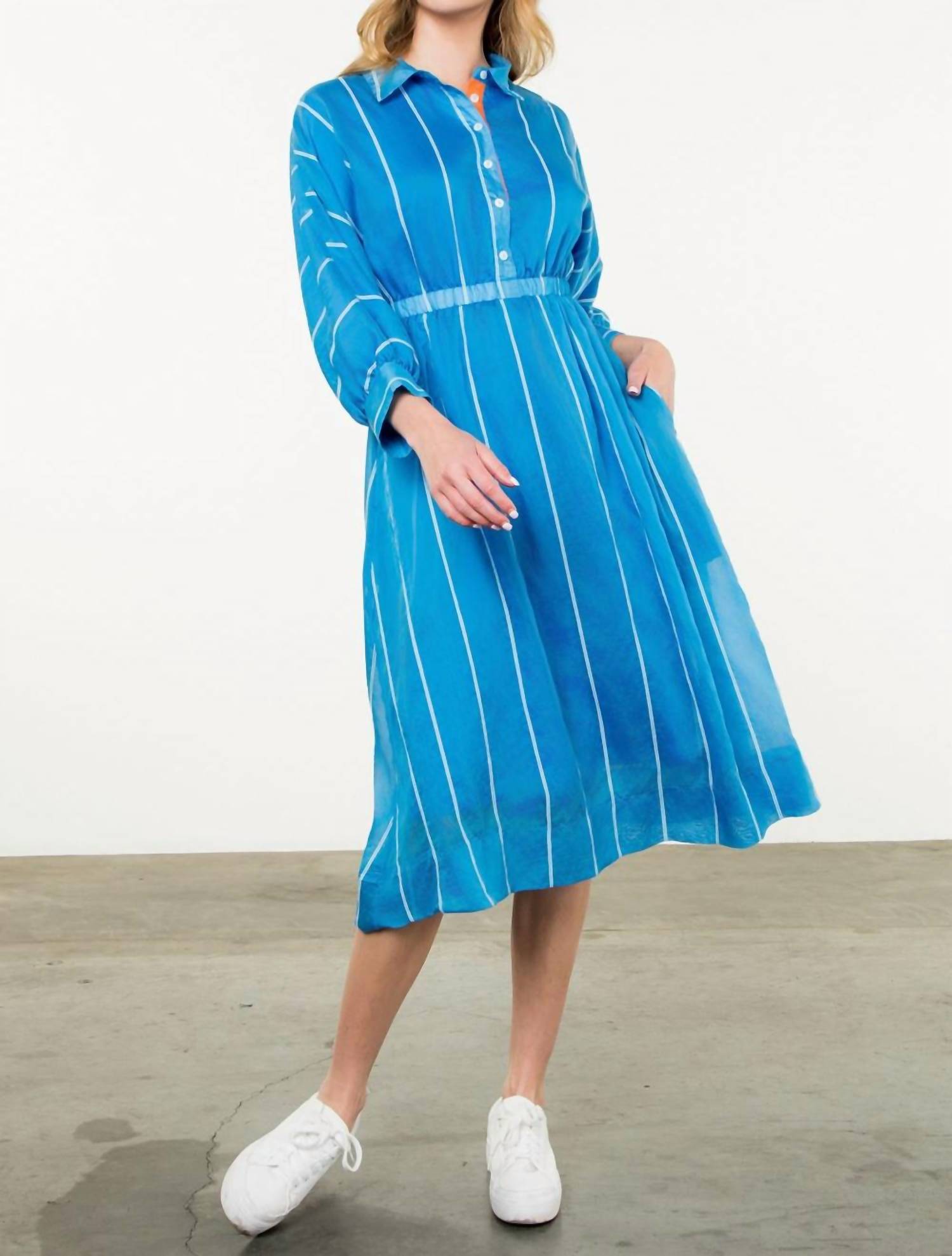 A midi dress so versatile, your options for wearing it are endless. Elevate your style with the Stripe Dress With Orange Detail by THML, a striking choice for any occasion. This women's shirt dress in vibrant blue features long sleeves and a distinguished collar, accentuated by blue stripes with an orange detail on the button hem. Crafted from a blend of 70% Tencel and 30% Polyester, it ensures lightweight comfort throughout the day. Closure: Button closure. The midi dress measures 47 inches in length and includes pockets for added convenience. Model is wearing a size S (5'9" height, 32" bust, 25.5" waist, 36" hips).
