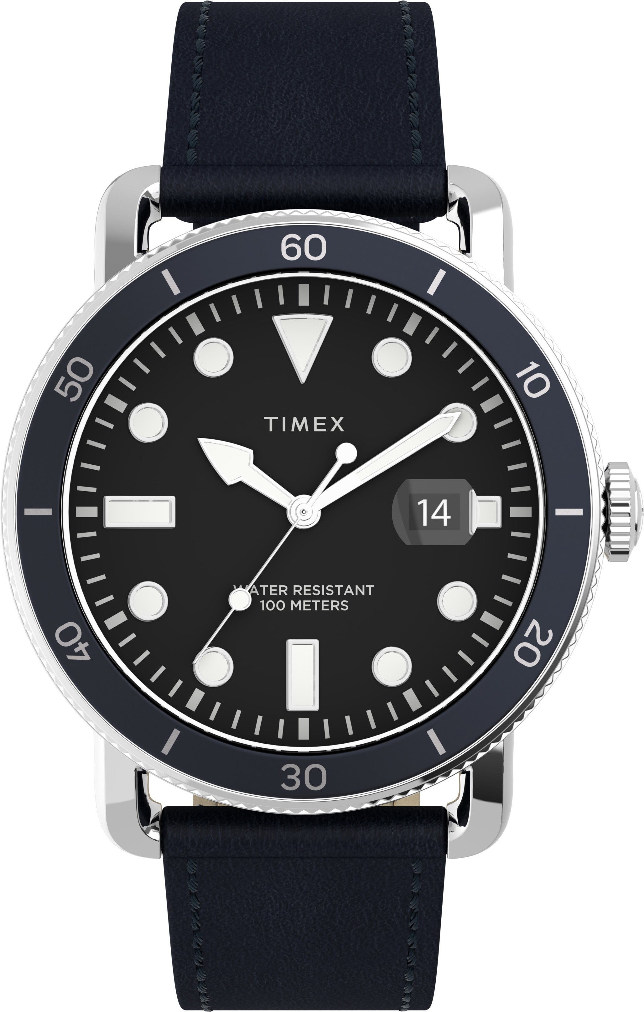 The case of this watch is constructed of high-quality stainless steel. The dial is black and protected by a durable mineral crystal with up to 100 m (330 feet) water resistance. The strap is blue leather. The movement is quartz