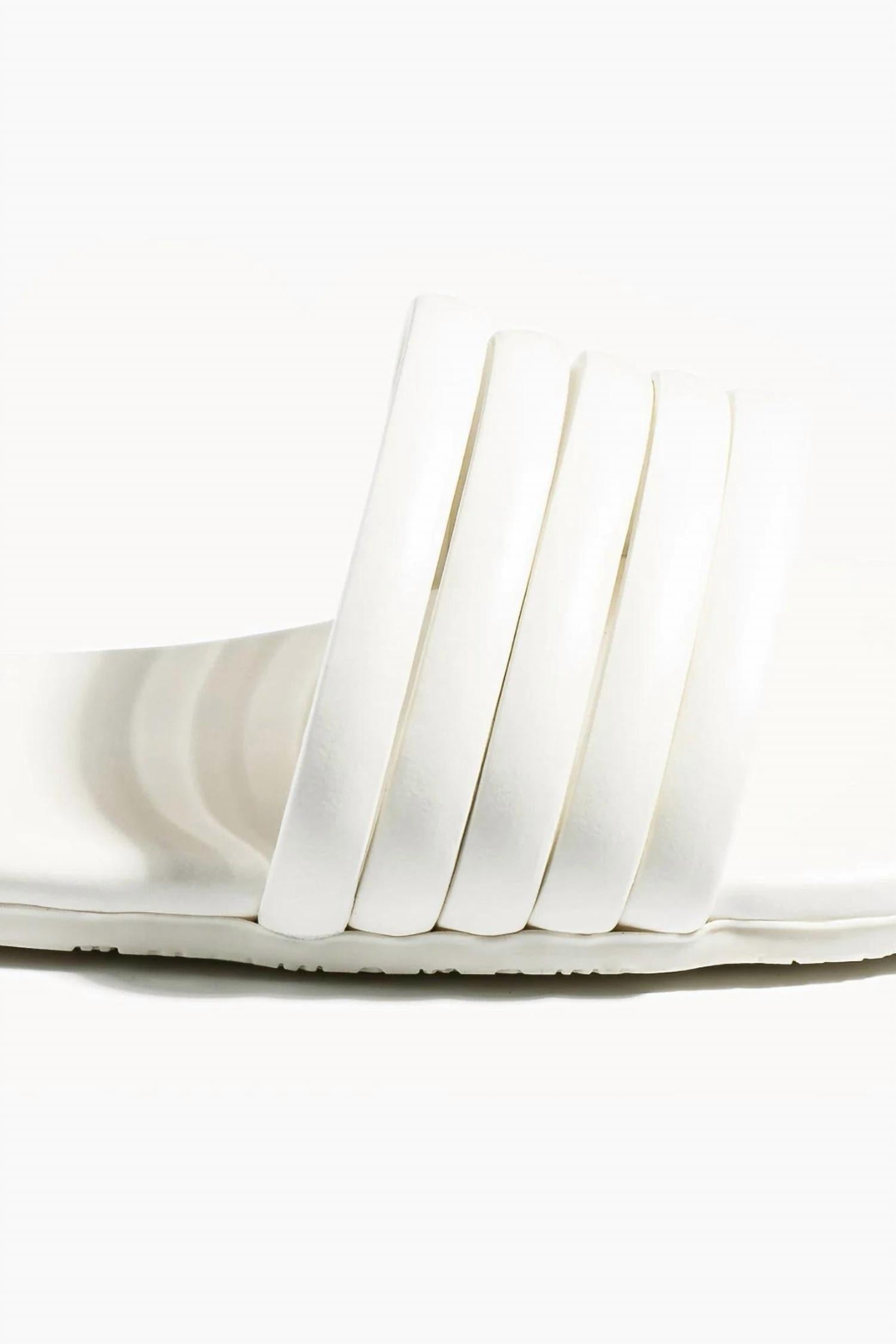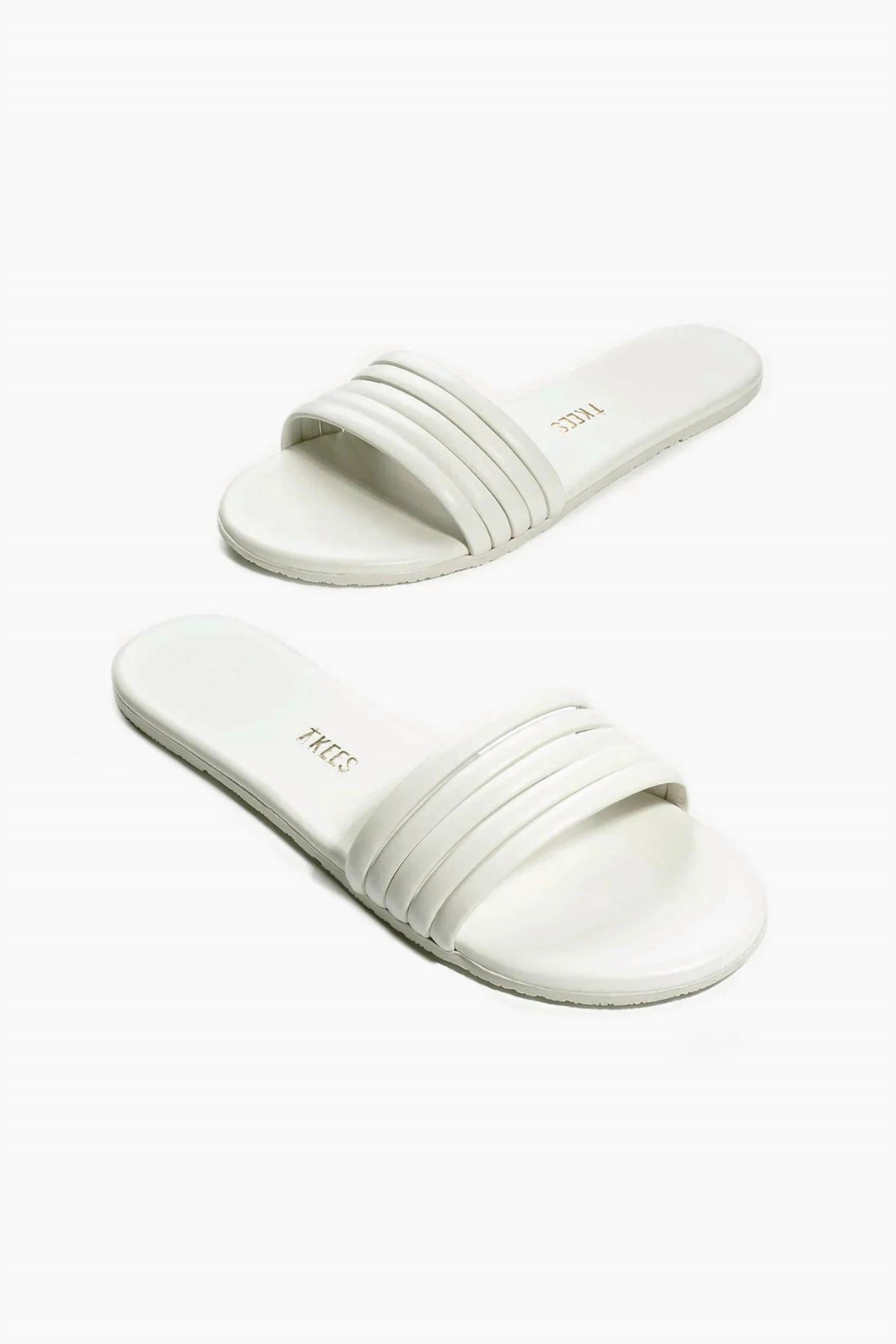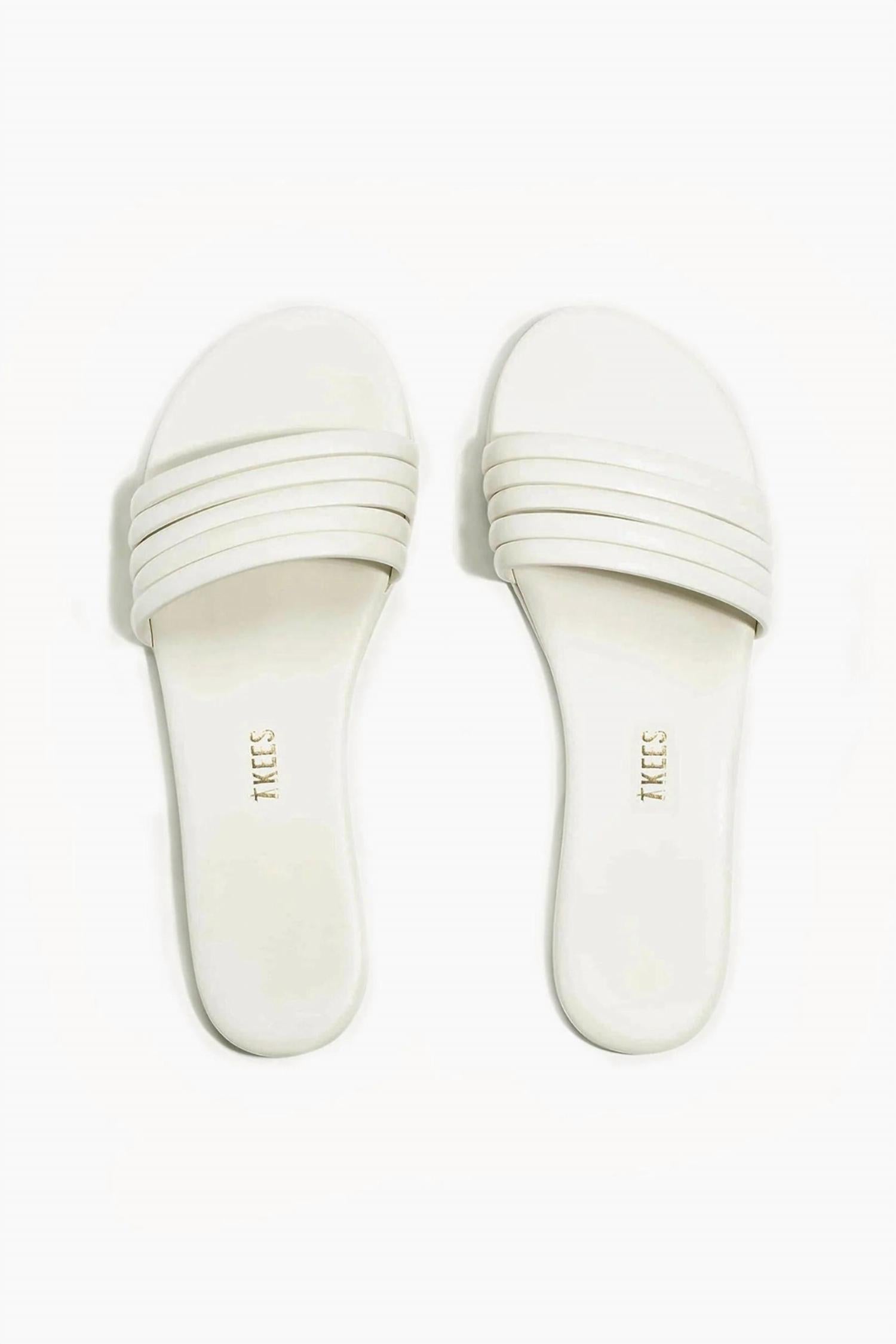 Slip into these, we promise you won't regret it. Meet the Serena Slide by TKEES, designed for those who appreciate both comfort and style in creamy elegance. Handcrafted in Brazil, these sporty slides feature five parallel strap designs made from premium leather that comfortably sit at the base of your toes. The leather upper is matched with a cushioned leather insole and a durable rubber outsole for ultimate ease. Perfect for those with narrow feet and available in US whole sizes, they require no break-in period.
