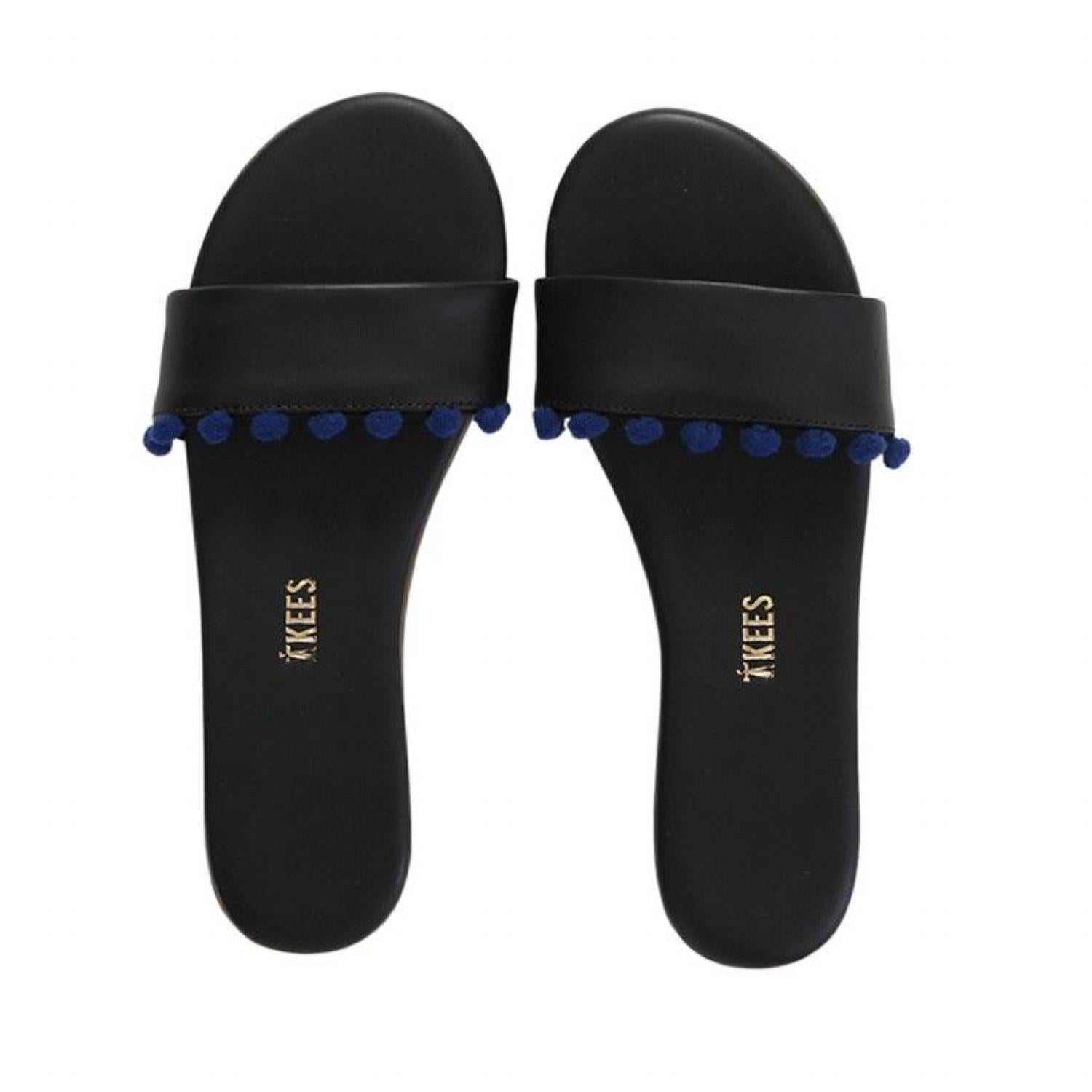 Tiny pom-poms trim the vamp and add a playful air to these leather TKEES slides. Single strap. Rubber sole. Leather: Cowhide. Imported, Brazil.