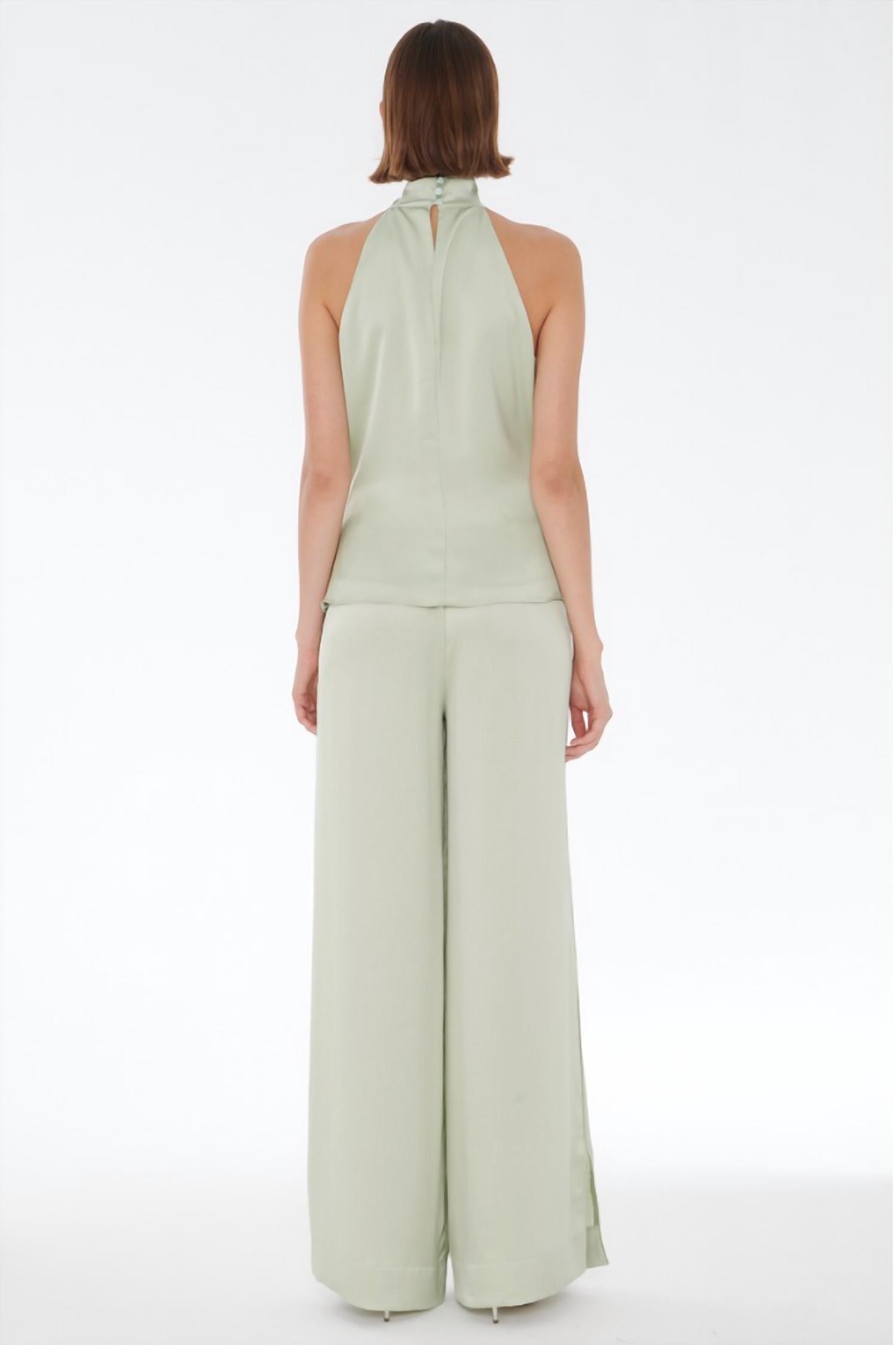Elevate your style with the Auggie Side Slit Pull-On Pants by Toccin, designed in a chic mint hue. These high-rise, wide-leg pants are crafted from a sumptuous silky satin blend of 85% acetate and 15% polyester, offering a relaxed fit perfect for spring dinners or St. Patrick's Day celebrations. The pull-on closure provides ease and comfort, featuring pockets to store essentials. Ideal for a touch of quiet luxury, pair them with the matching top for a sophisticated ensemble.