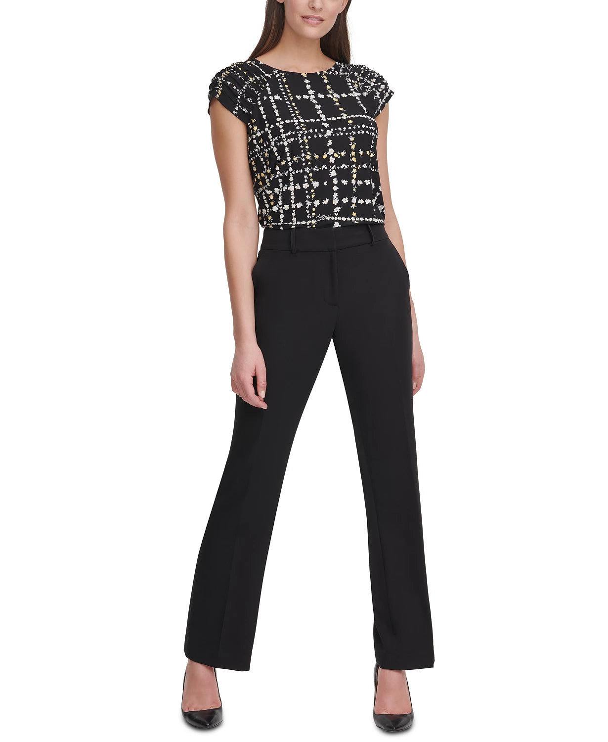 Crewneck|Short sleeves with ruching|Polyester/spandex|Dry clean|Imported